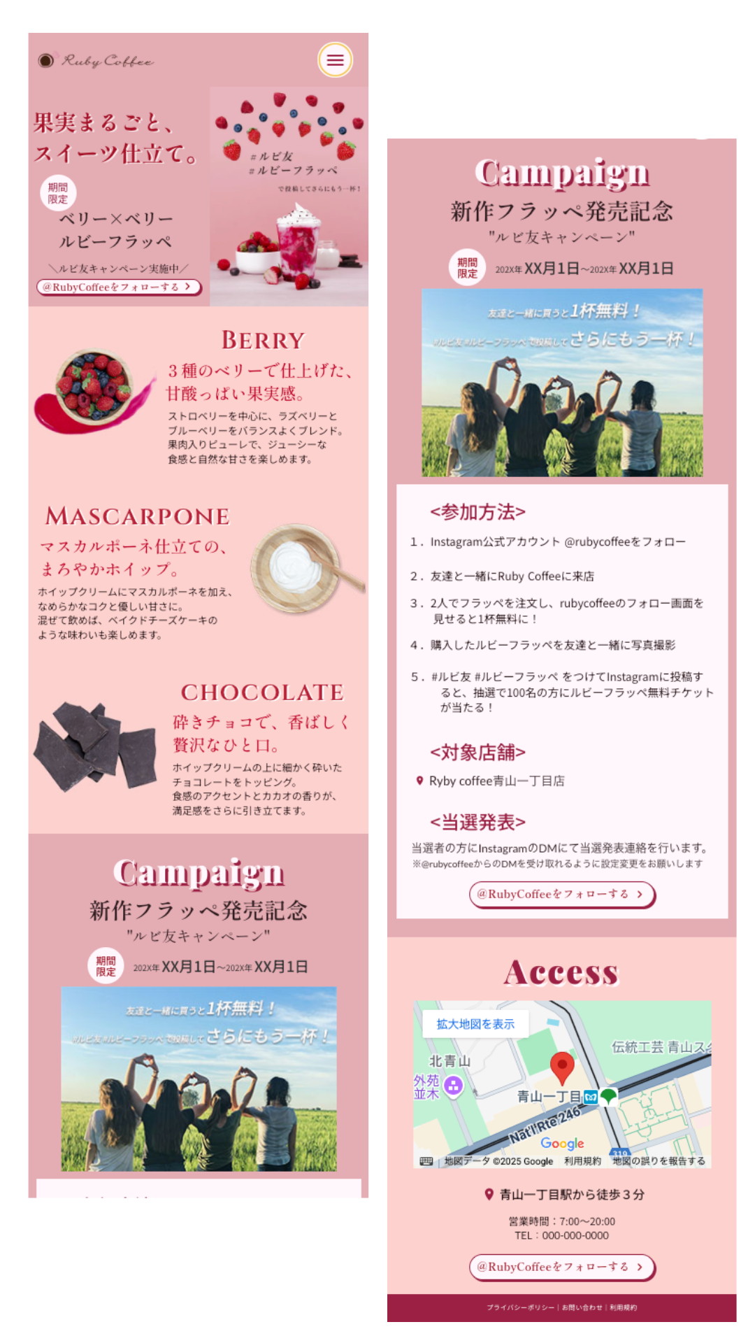 アクセントにはラズベリーをイメージした濃い赤を使用し、印象に残るデザインに仕上げています。