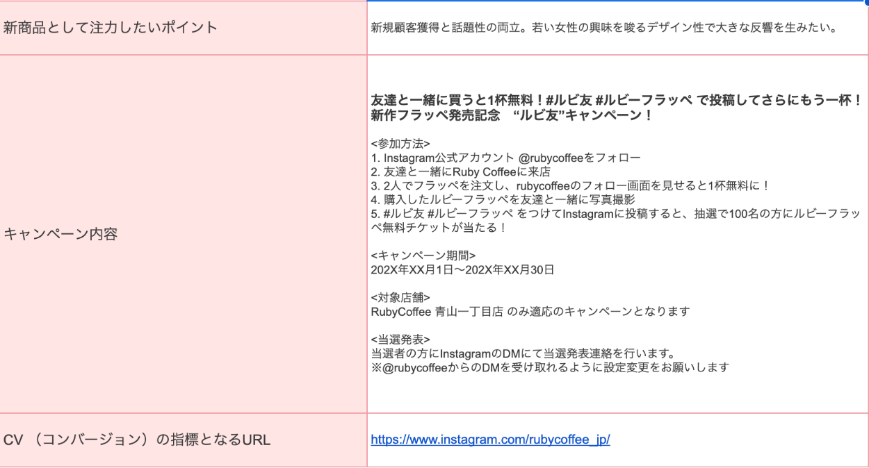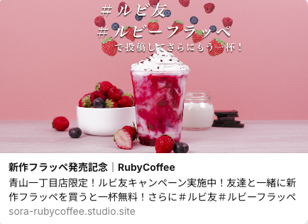 説明文:青山一丁目店限定!ルビ友キャンペーン実施中!友達と一緒に新作フラッペを買うと一杯無料!さらに#ルビ友#ルビーフラッペで投稿してもう一杯無料!