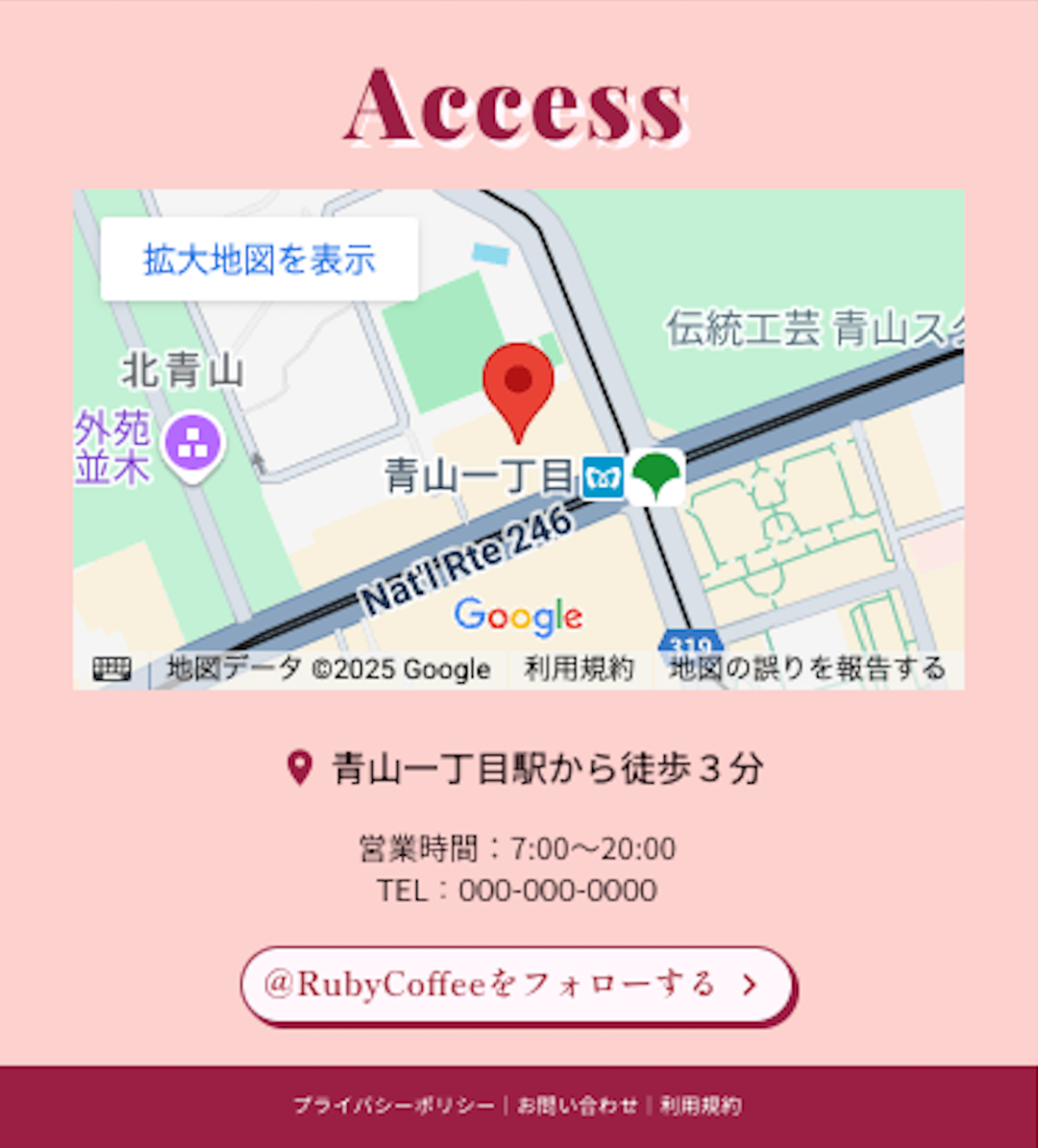 ・アクセスページにはGoogleマップを埋め込み、LPを見た方が迷わず青山一丁目店まで来られるようにしています。