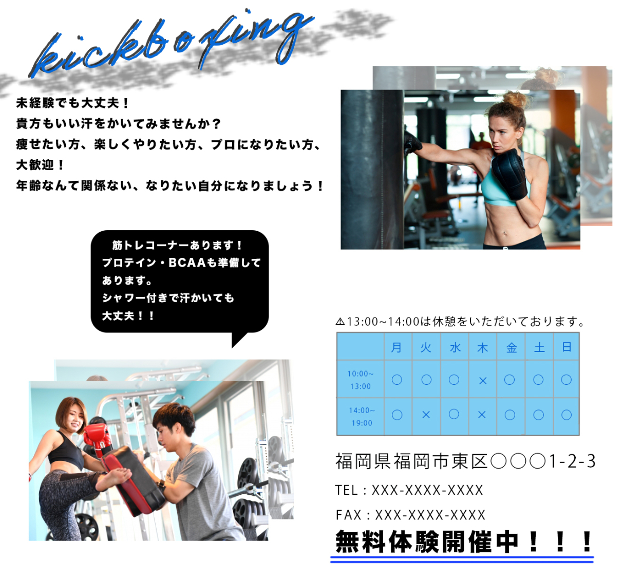 kick boxing momoka webデザイナー キックボクシングの広告を作ってみました。バランスがとても難しかったです。かかった時間は4時間くらいかかってしまいました。何かモデルなどをみながら作るようにしていきたいと思います。
