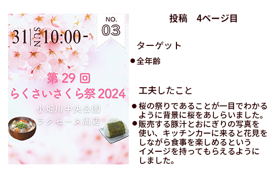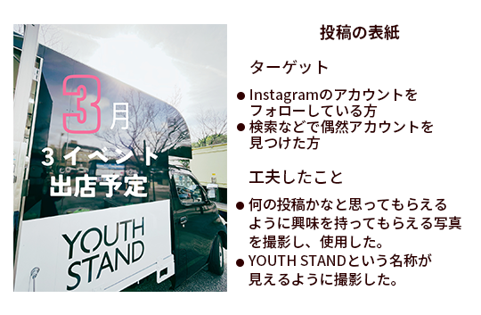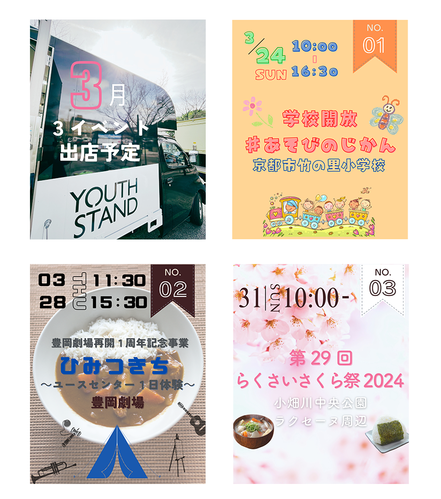 京都市ユースサービス協会の若者の居場所づくりを目的としたキッチンカーの出店を周知するために、3月の出店予定をまとめたInstagram投稿を作成しました。(取り組み時間:4時間)