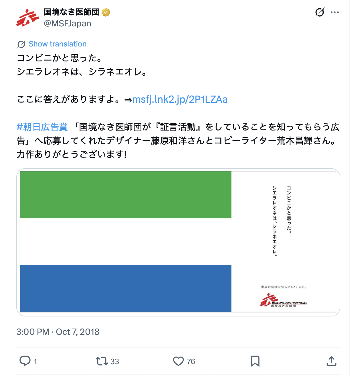 2018年度 広告主:国境なき医師団 課題:証言活動 作品タイトル:世界の危機を知らせることから。
