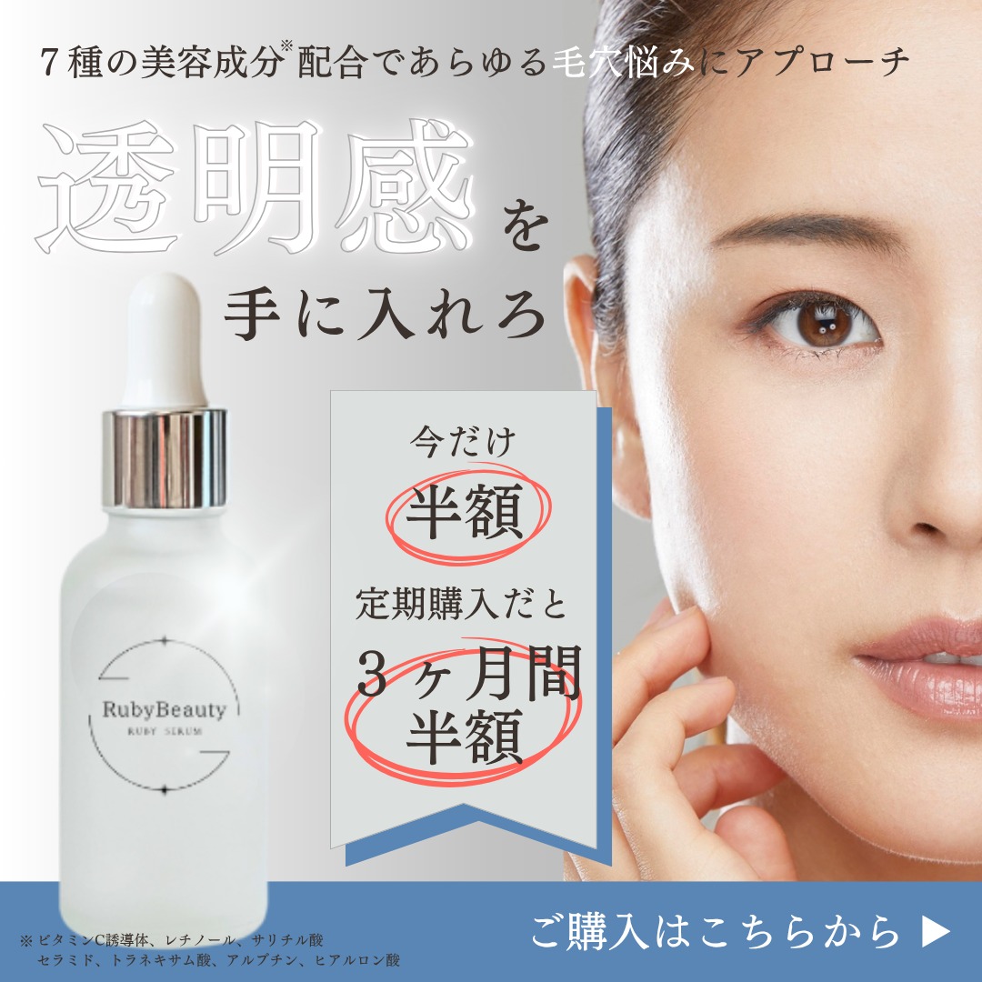 無添加の素材を使用し、女性の美容悩みに特化したスキンケアを販売しているRuby Beauty。今回は毛穴ケアに特化した新商品の美容液の紹介とそれに伴う半額キャンペーン実施の案内、購入を促すバナーを作成しました。※こちらは架空案件です。