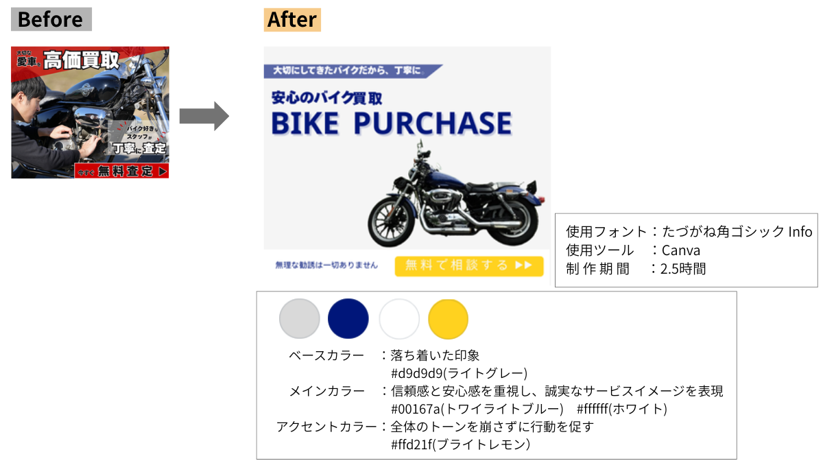 - 情報を詰め込みすぎず、バイク画像とテキストの余白を確保することで、視認性と読みやすさを向上させました。