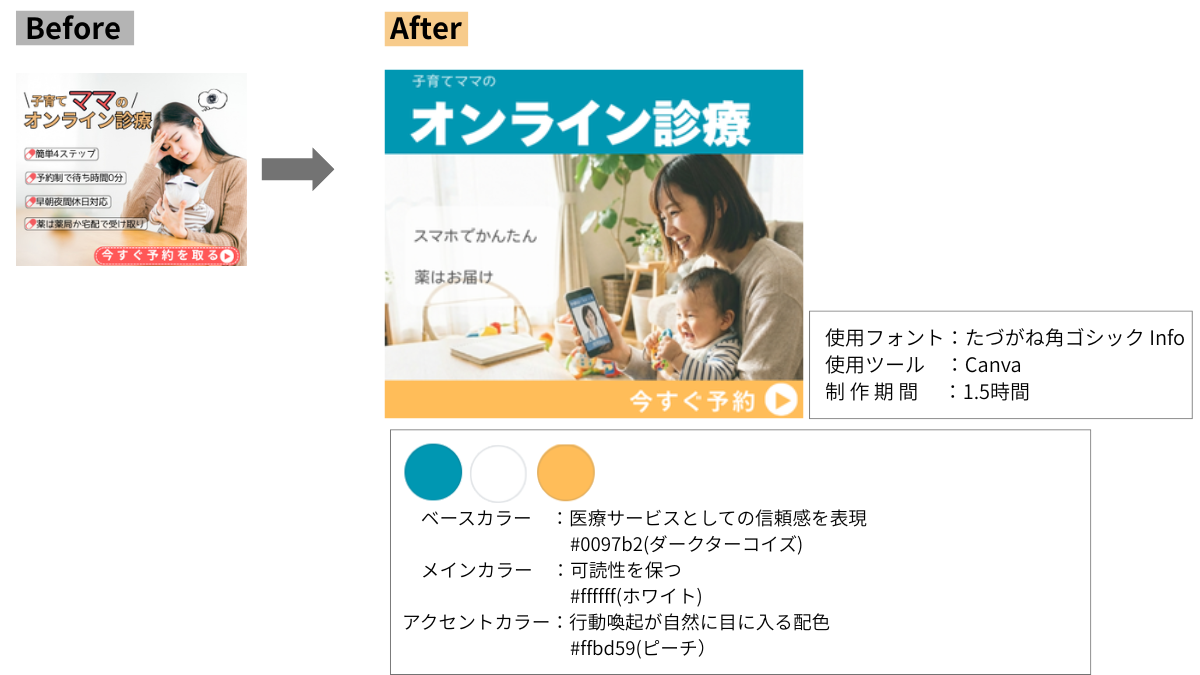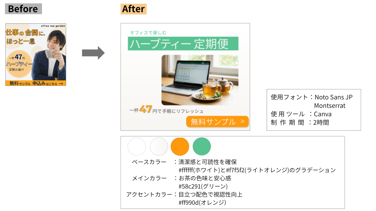 職業訓練校の課題として作成したオリジナルバナーに対し、講師からのフィードバックをもとに、情報の整理・優先順位付け・視認性向上を意識して改善しました。
