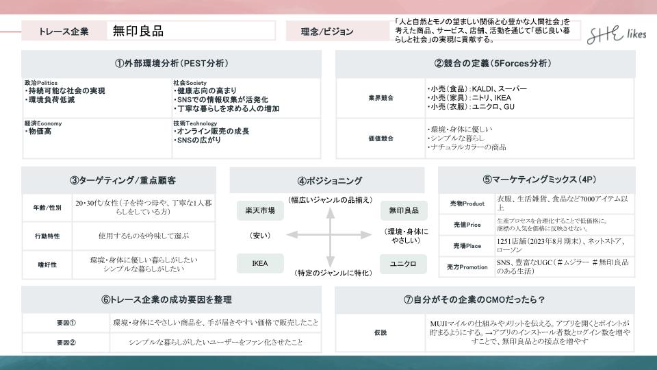 【制作課題】マーケティングトレース(無印良品) izumi 動画編集者 〈SHElikes Webマーケティングコース 実技試験〉題材:無印良品キャリアスクールSHElikesのWebマーケティングコースの実技試験で制作したマーケティングトレースです。
