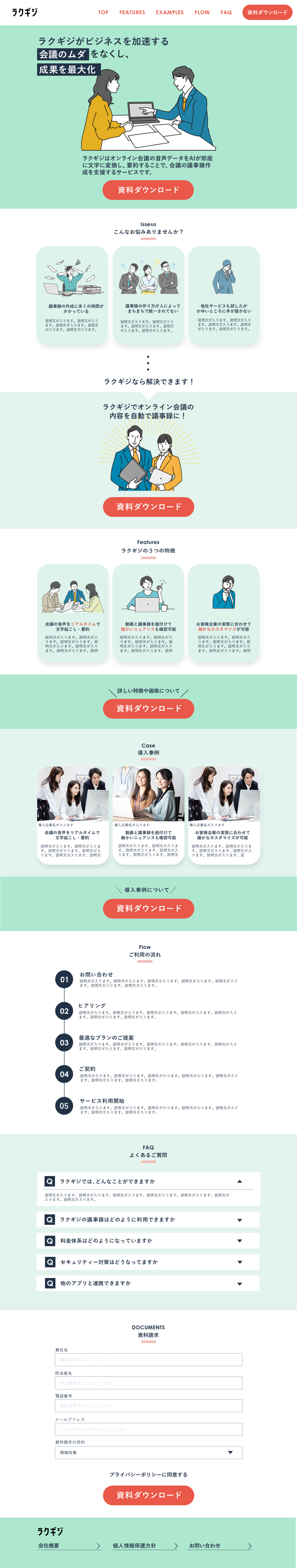 SHElikesの課題でオンライン会議等の音声をAIが議事録を自動で作成してくれるサービスのLPを制作しました。架空のクライアントからの依頼内容を想定しております。サービスに興味を持った人が資料ダウンロードを押すことを制作目的としブランドの世界観を作り込みました。
