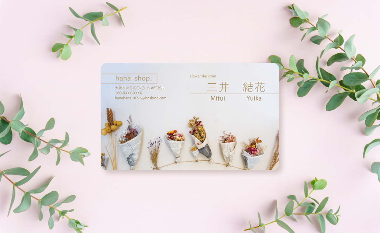 ペルソナ▷三井結花 26歳 都内で働く花屋でキャリアを積み、様々なフラワーアレンジメントの依頼を受けるようになるので名刺を新たに制作。生花よりドライフラワーのアレンジが得意。温和そうな女性。また作る作品も温かみのある雰囲気色合いが多い。