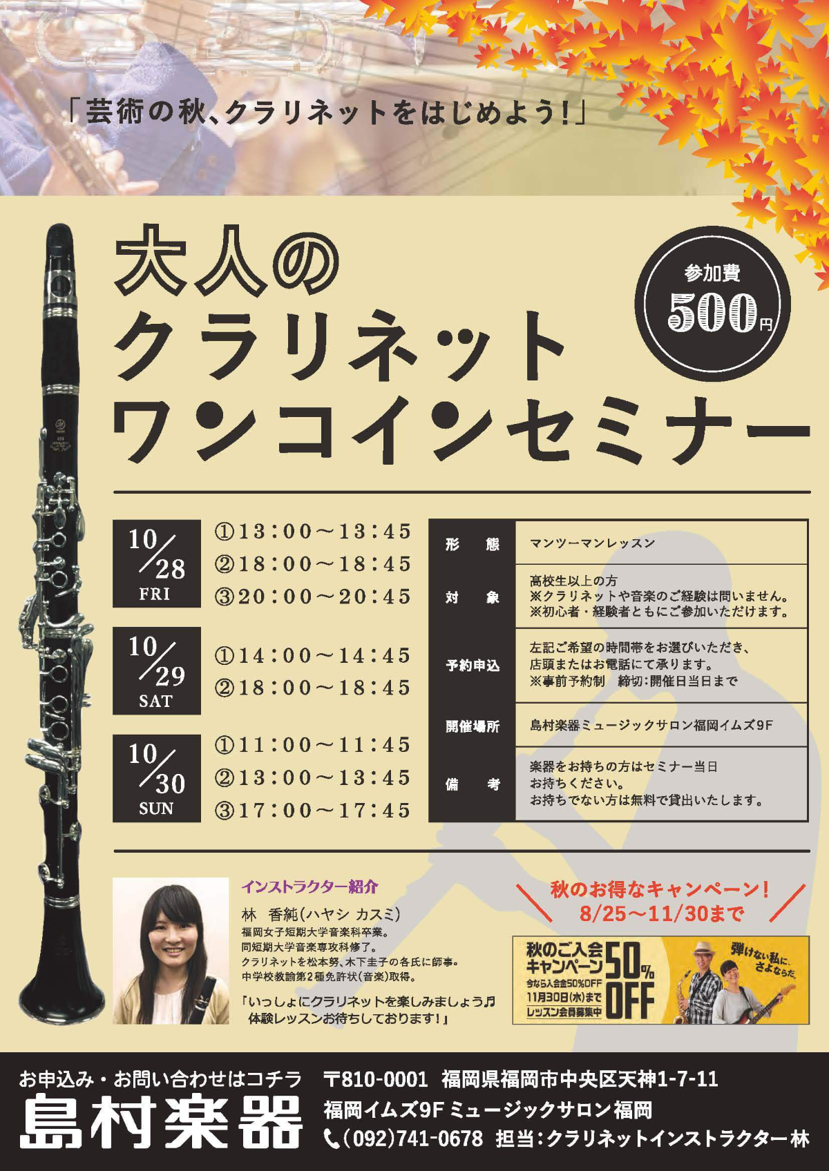 【島村楽器店様】大人のクラリネットワンコインセミナー きくまりこ Web/UIデザイナー OVERVIEW チラシ YEAR 2016 島村楽器店様のチラシを制作しました。【サイズ】■A4【担当】チラシデザイン【使用ソフト】Adobe Illustrator