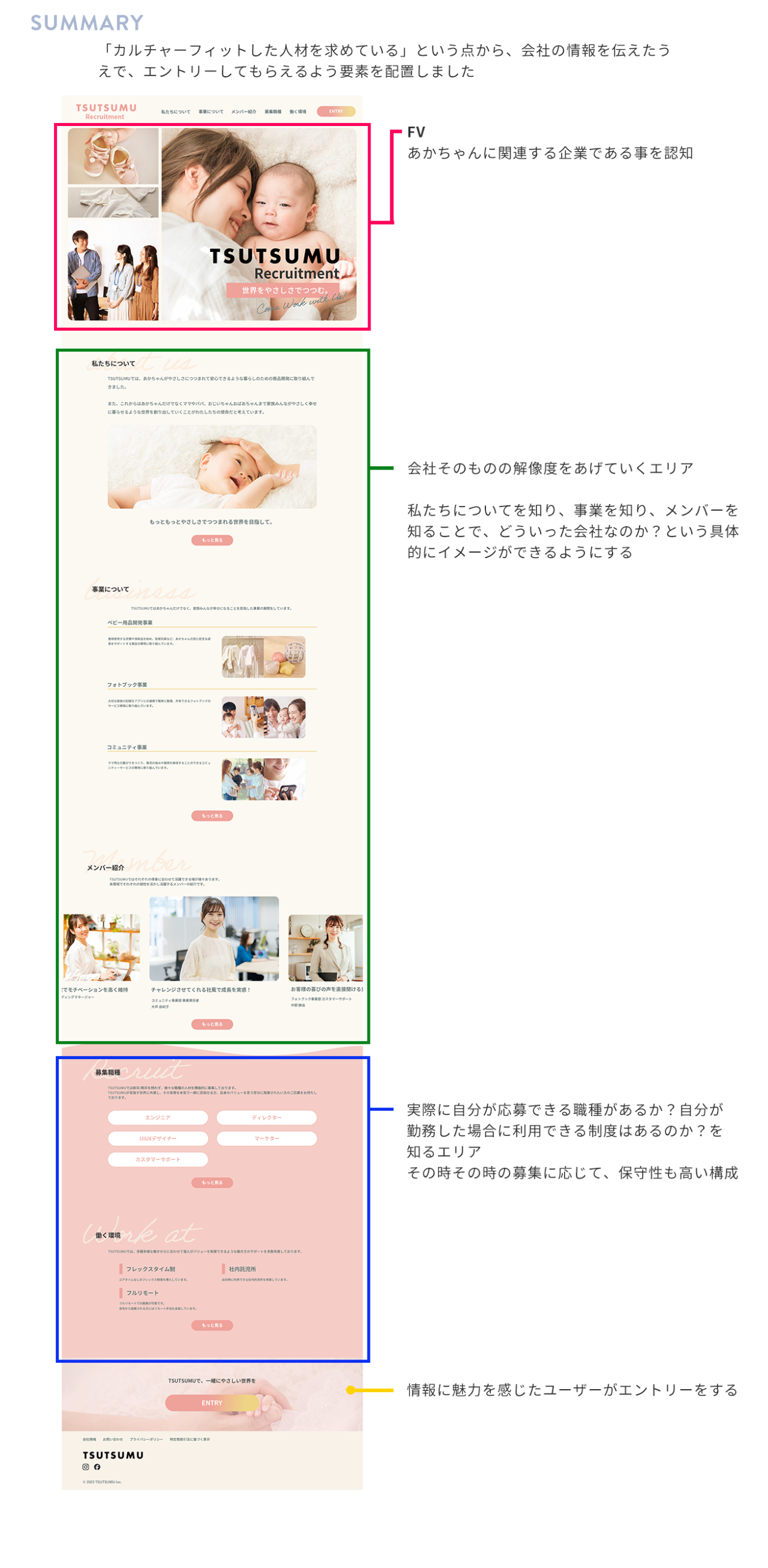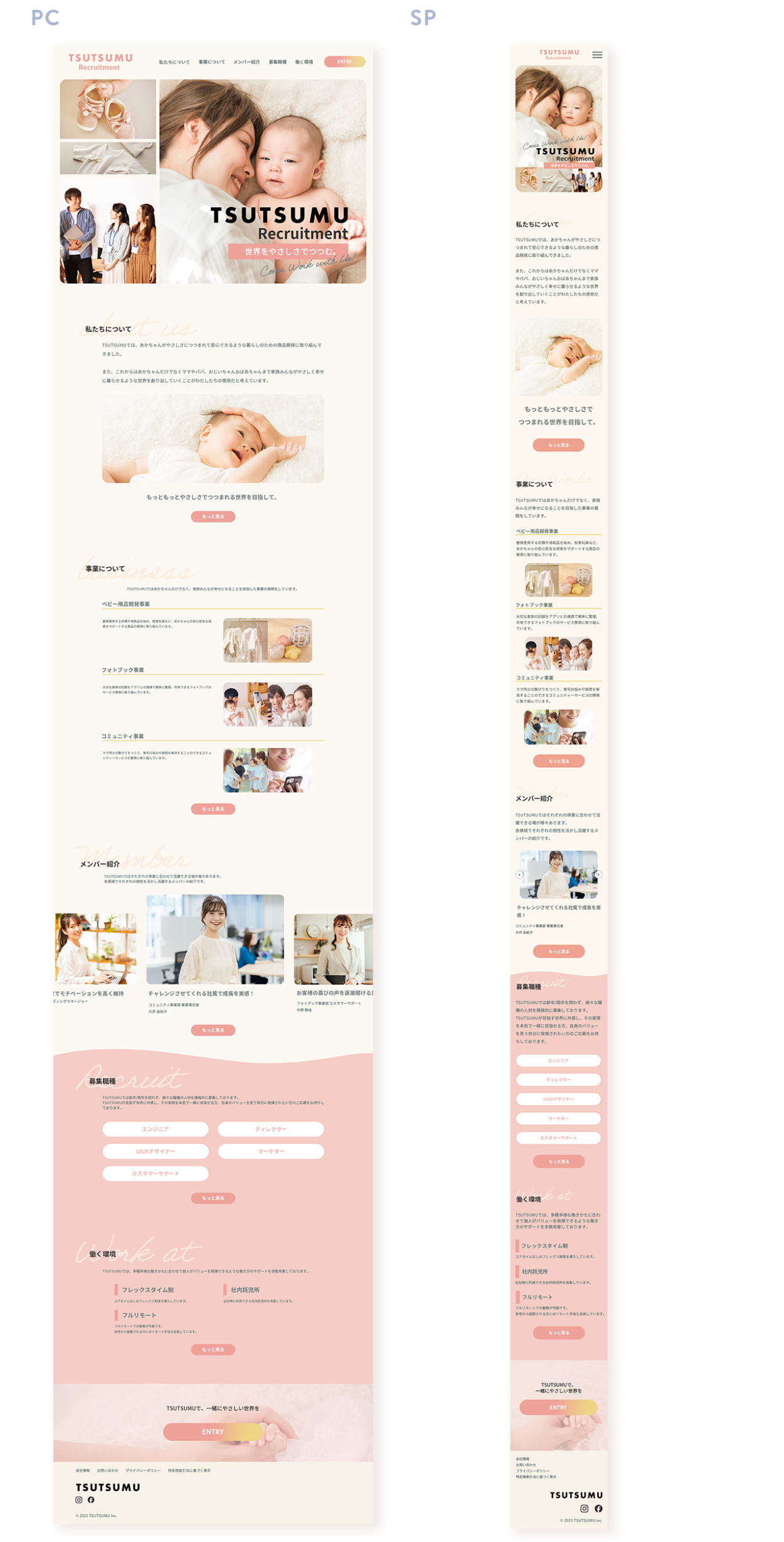 あかちゃんをメインに、リクルートサイトであるということを示すために、事業に関連する写真、働いている人の写真を使用したKVを作成。雰囲気を伝える。