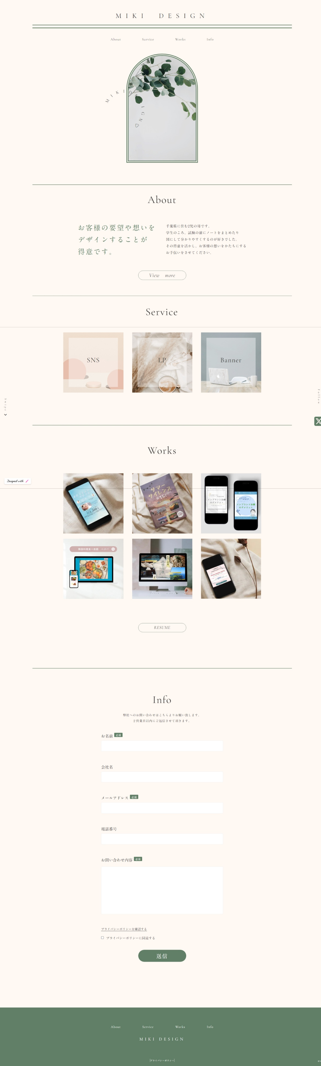 ピンタレストなどで参考サイトを探しているときに、緑に目が行ってお気に入りをしていることが多かったので緑をアクセントカラーにし、ナチュラルな雰囲気にしました。