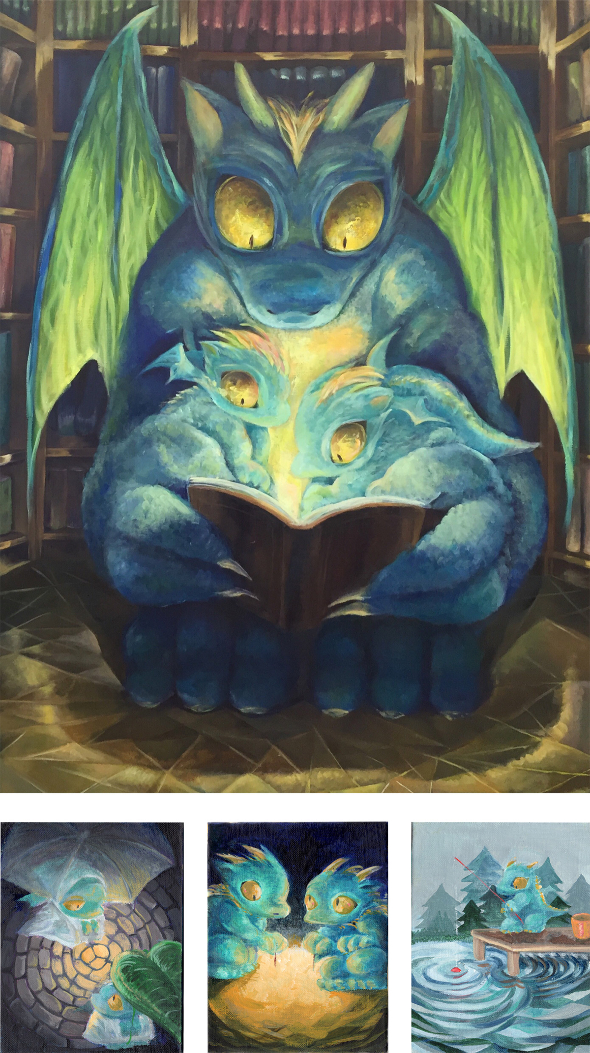 油彩画 アクリル画 1年次進級制作「親子龍とこどもたち」F80号 F0号×3 2017.2