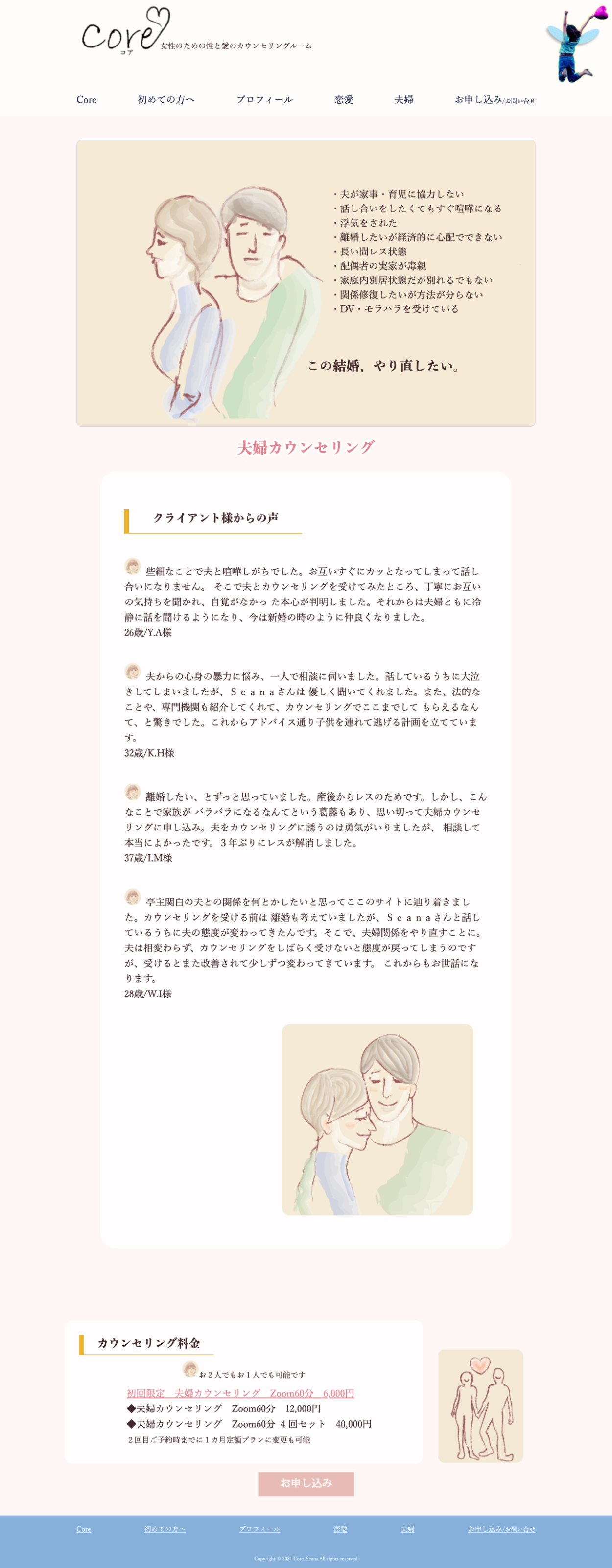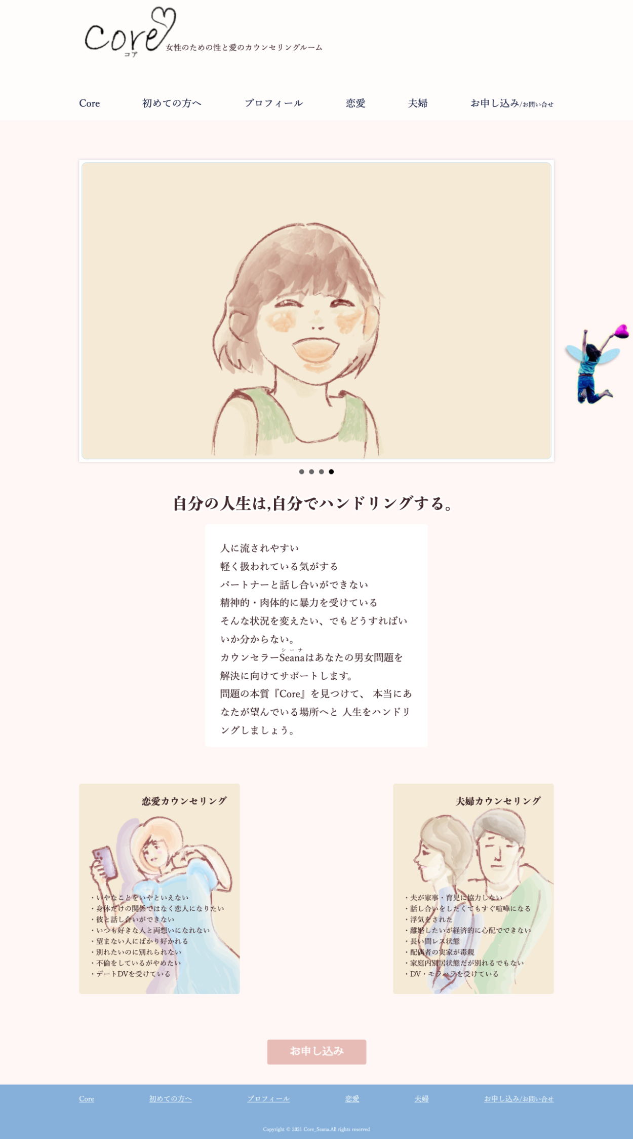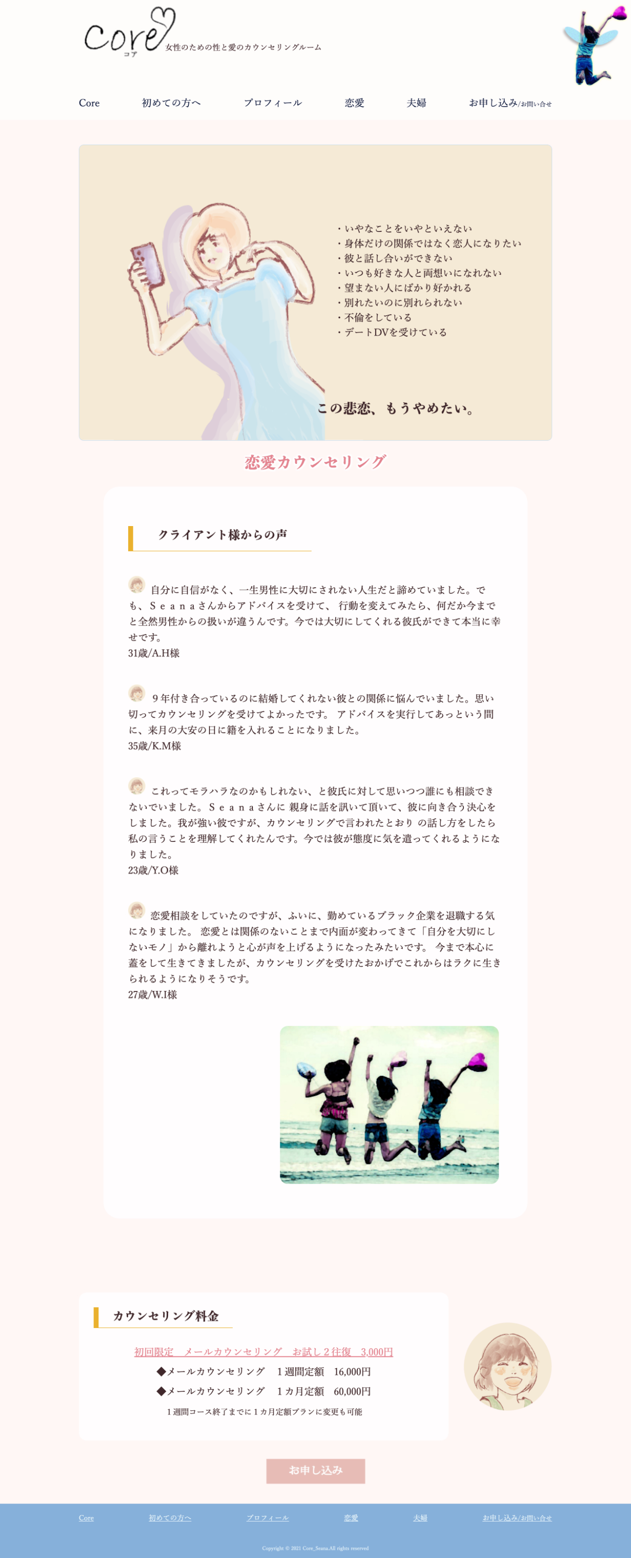 - Webサイトを立ち上げる目的 | 性愛問題に特化した女性向けカウンセリングルームを新規オープン⇨新規顧客の獲得、ブランディング、認知を広める⇨信頼感、問題解決能力の高さをアピールし、初見の方に安心感を与え、申し込みへと導きたい。