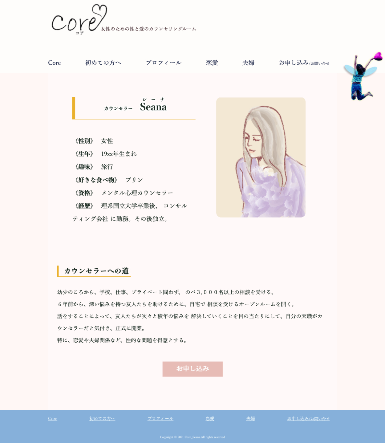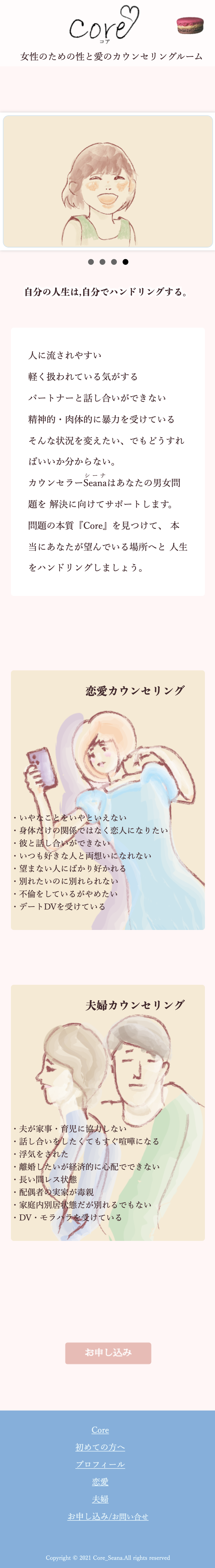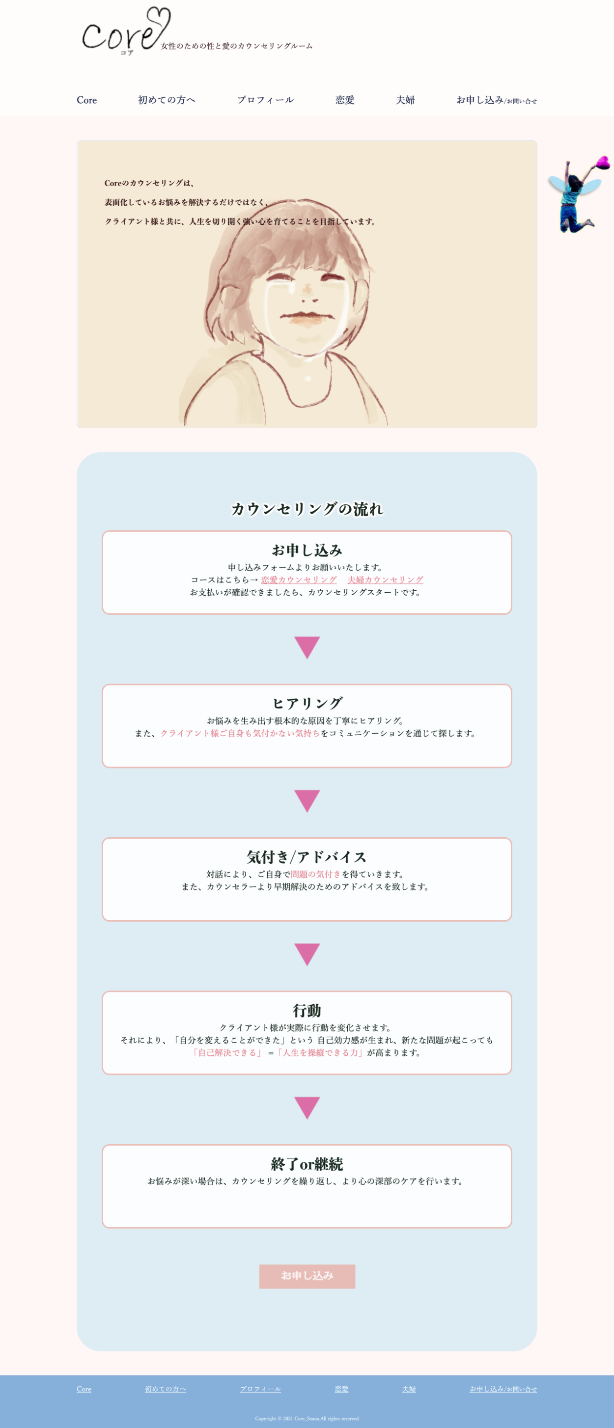 - Webサイトを立ち上げる目的 | 性愛問題に特化した女性向けカウンセリングルームを新規オープン⇨新規顧客の獲得、ブランディング、認知を広める⇨信頼感、問題解決能力の高さをアピールし、初見の方に安心感を与え、申し込みへと導きたい。