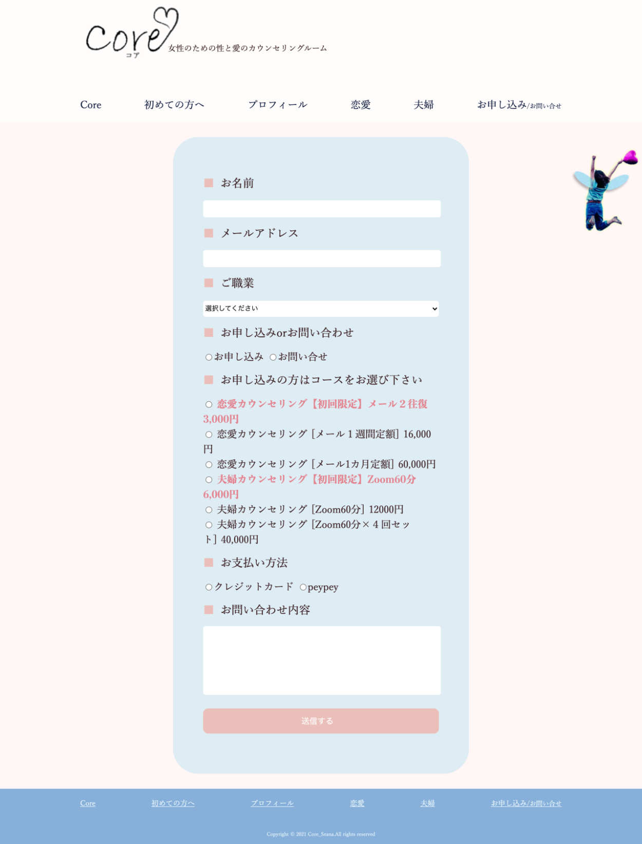 カウンセリングという特性上、「お問い合せ」でカウンセリングを流れで行うことがないよう、明確に「お申込み/お問い合わせ」の選択肢を作成しています。