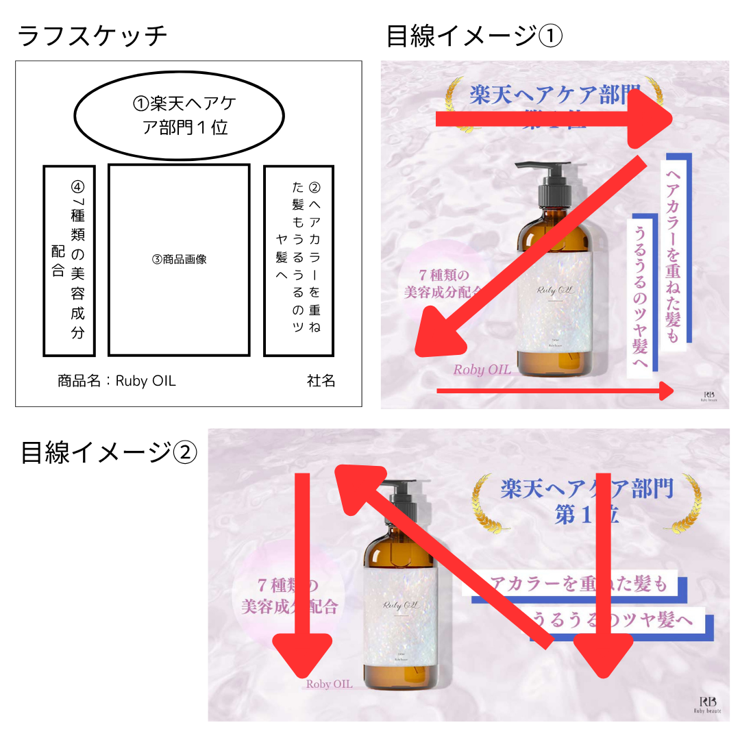 1番目に見てほしい「楽天ヘアケア部門第1位」にアクセントカラーを使用、2番目に見てもらいたい「ヘアカラーを重ねた髪もうるうるのツヤ髪へ」の背景色にアクセントカラーを使用しました。