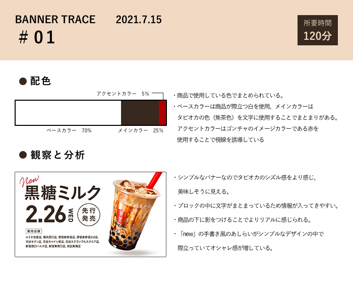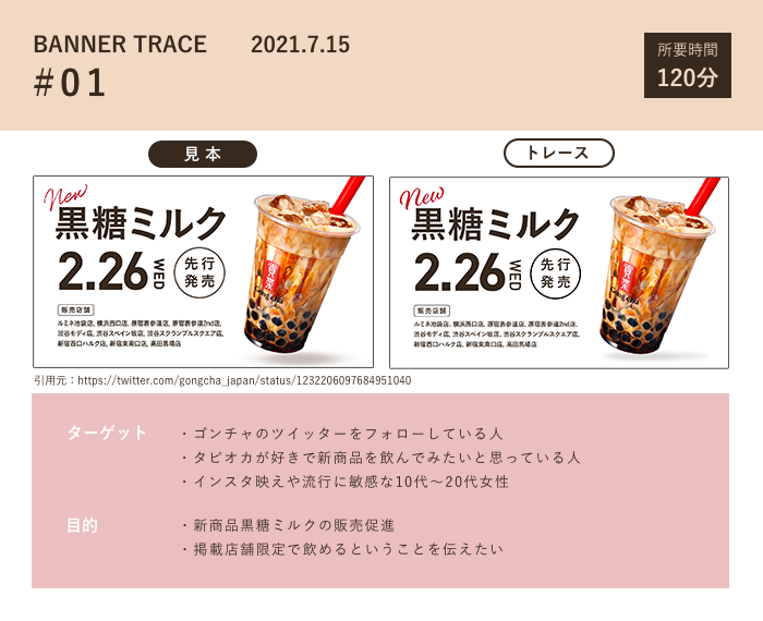 タピオカの影の付け方を色々調べて楕円形を二重に重ねて中心と周りの濃淡を再現したところが頑張ったポイントです。また、あしらいがほぼないシンプルなバナーだからこそ見本に忠実になるように類似フォントを探して作成しました。