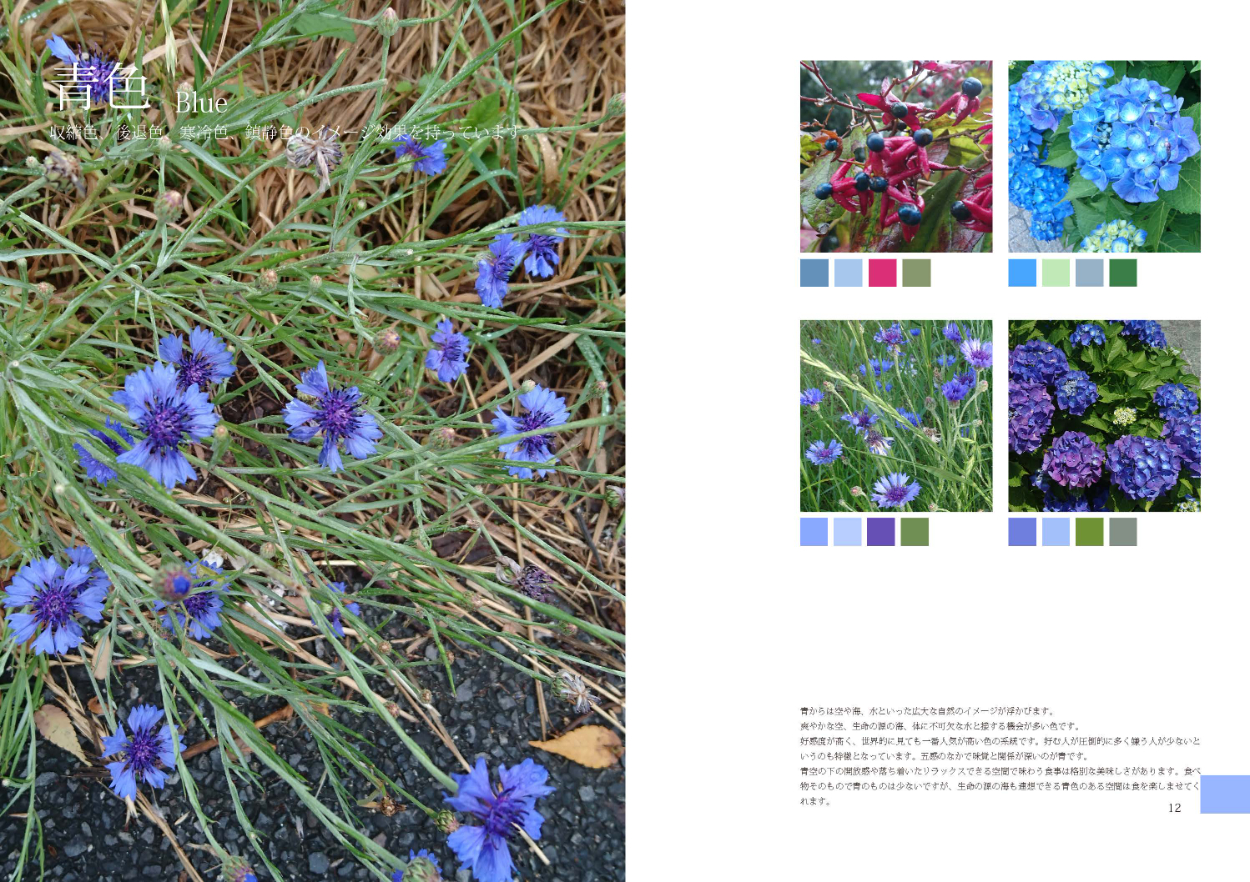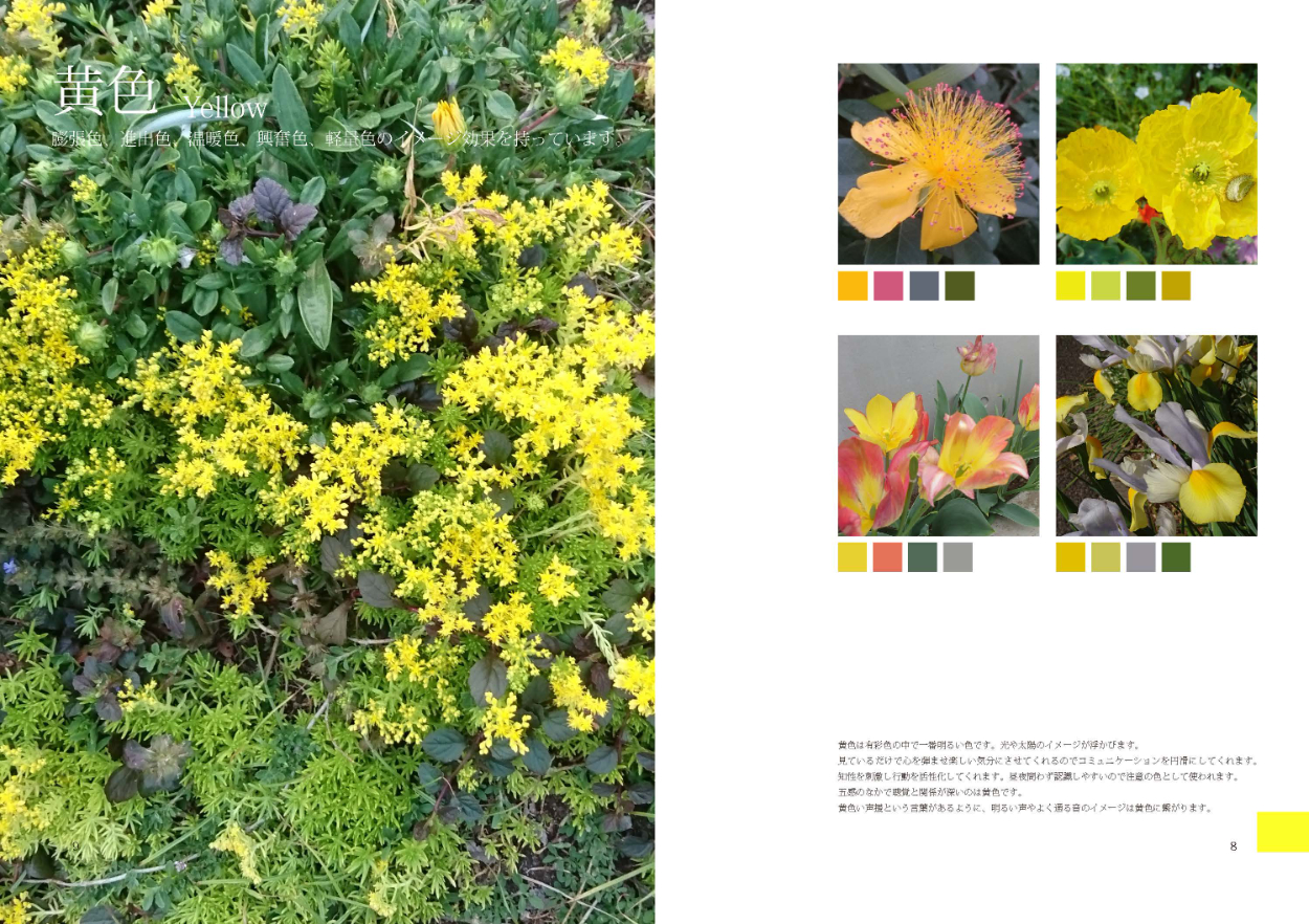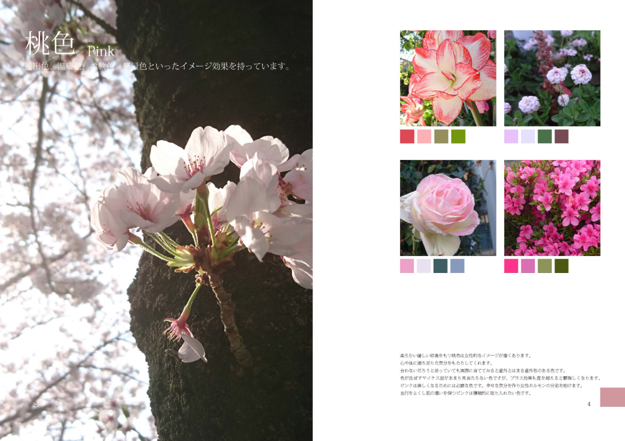 授業課題。Adobe InDesignを用いて冊子を制作する課題。テーマは自由。自分は花の写真を用いたカラーパレットの冊子を制作した。