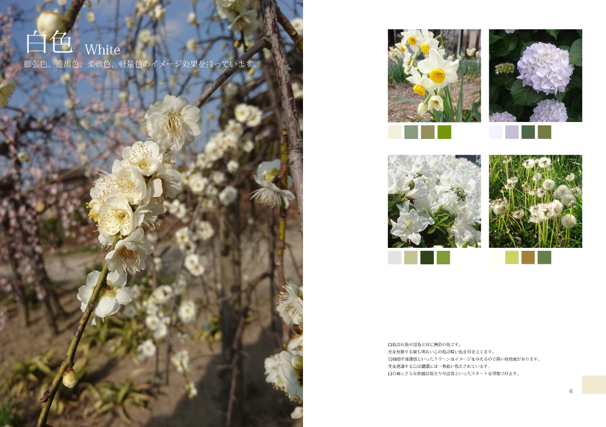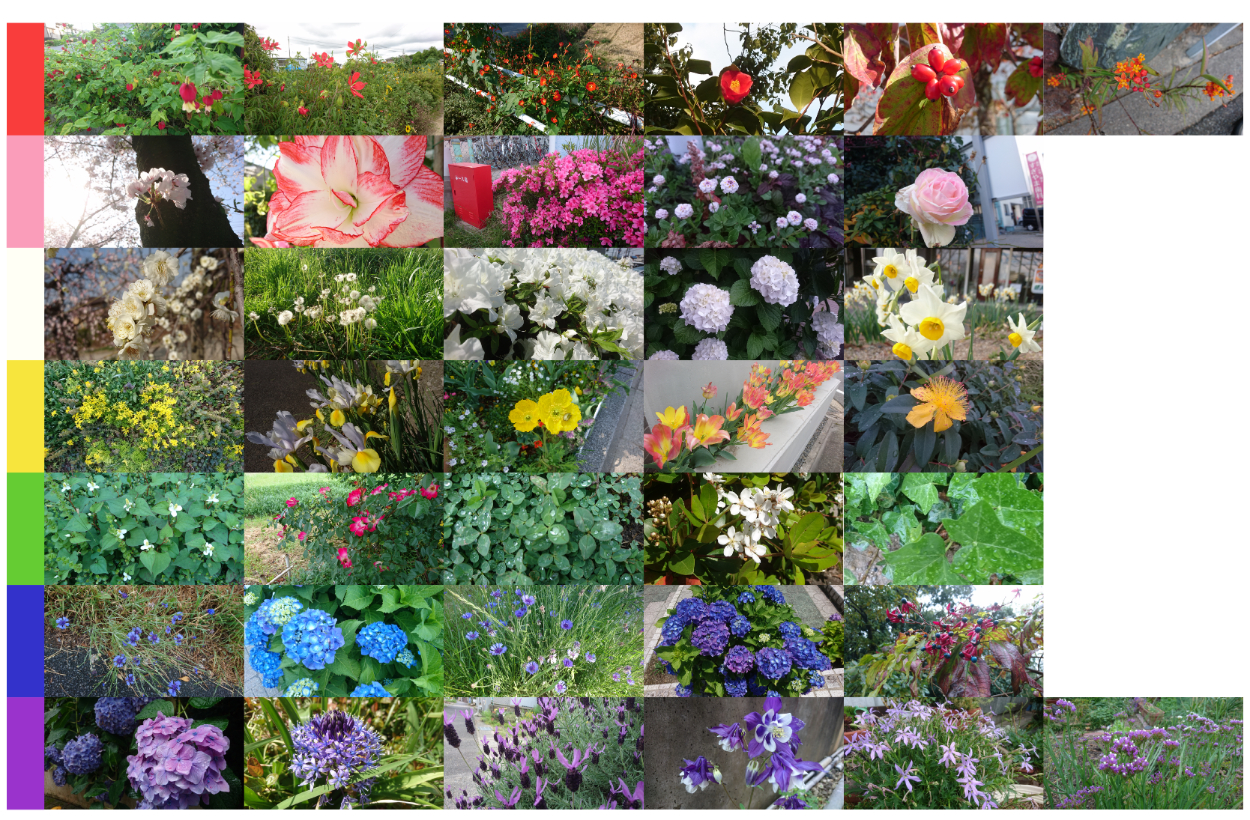 赤、桃、白、黄、緑、青、紫の植物の写真を撮影、選定した。