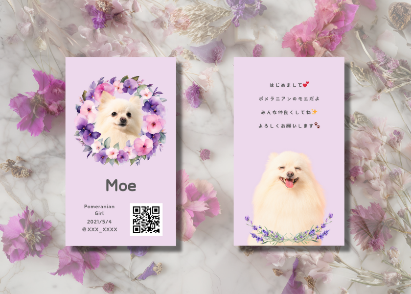 ペット名刺 Vol.1 R.KIKKAWA OVERVIEW CANVAを使用した名刺の制作 制作日:2024.9 制作時間:約2時間 使用ツール:CANVA CANVAのAIで背景のリースを生成しましたカラーをピンクとラベンダーでかわいらしいイメージにしました表と裏で印象の違う写真を選択し、いろんな表情をアピールしています