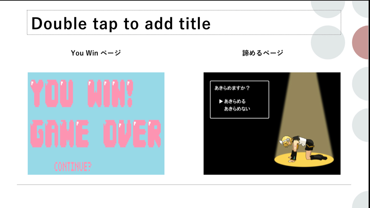 こちらはYou Win のページです。そしてもう一つのページがあります。それは諦めるページそれはなんですか?そのページは一度の確認です。本当に諦めるか?もしまだチャレンジしたい場合は諦めないの字をクリクしてもう一度stage1から始まります。
