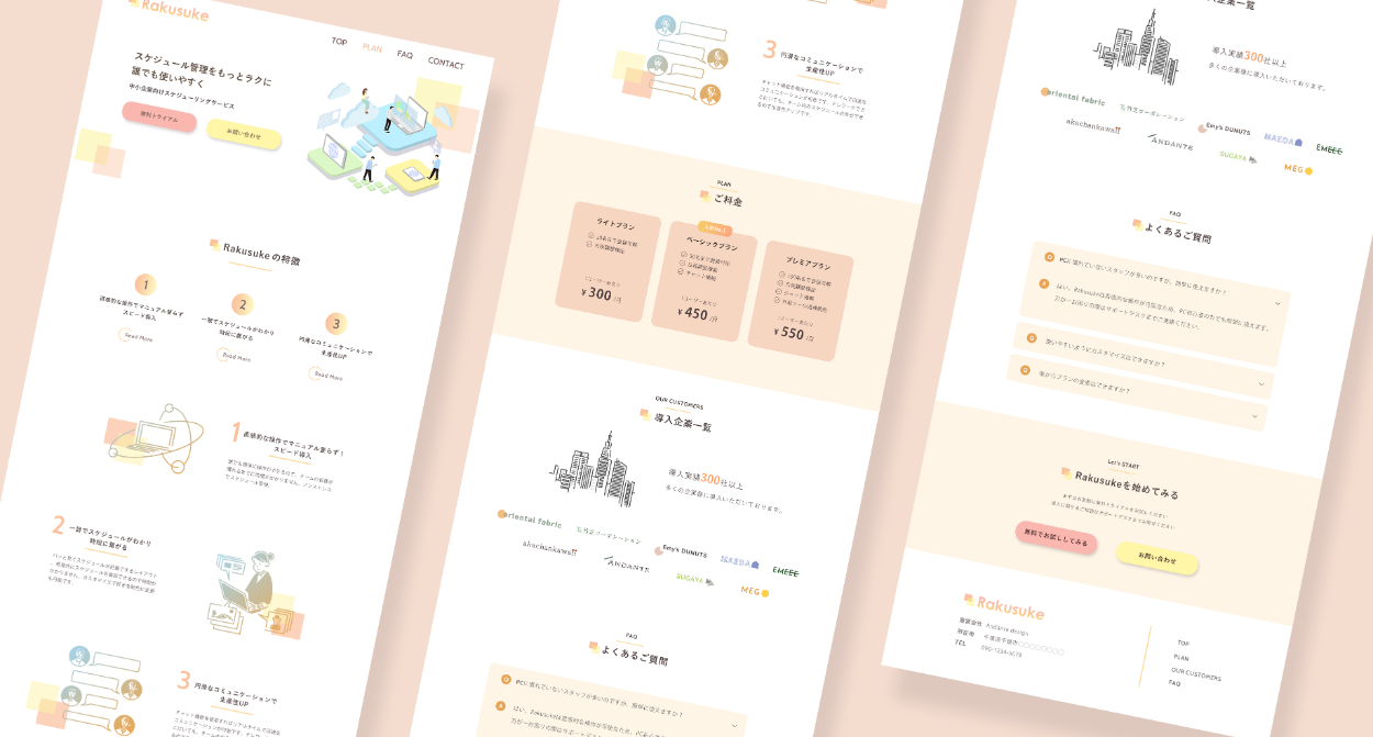 サクッと導入でき、簡単に使用できることが強みのサービス。スケジューリング管理の煩わしさを感じさせないよう、明度の高い配色でまとめております。近代的なwebサービスというアピールポイントが伝わるように、各イラストやロゴにぬけ感のあるグラデーション加工をしています。