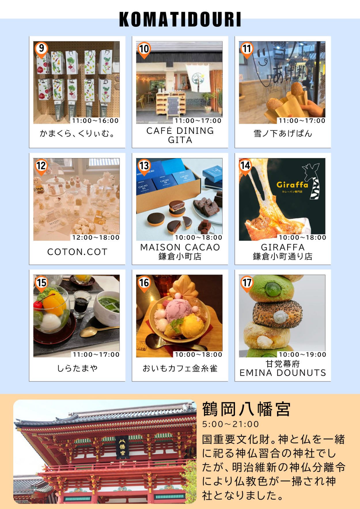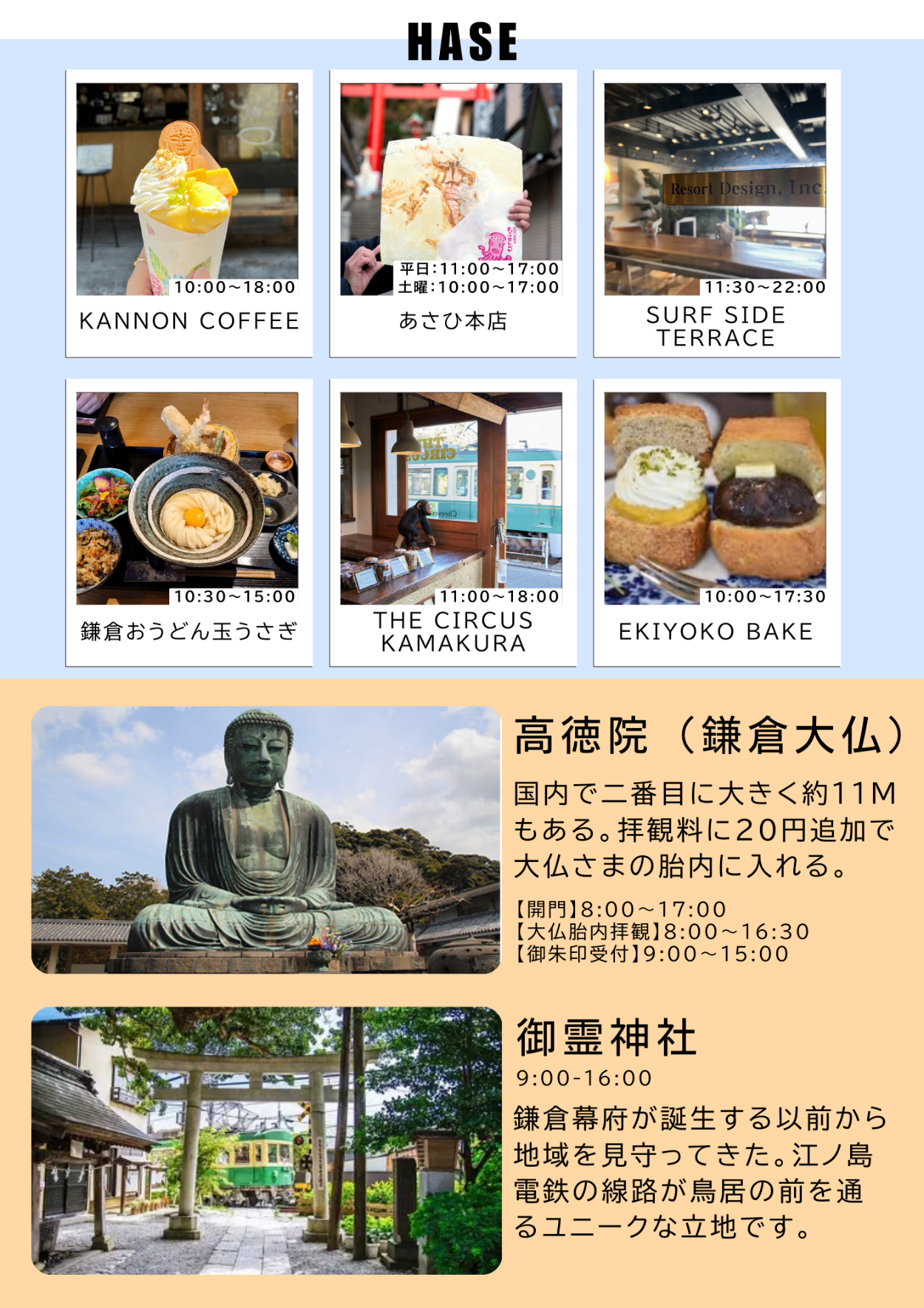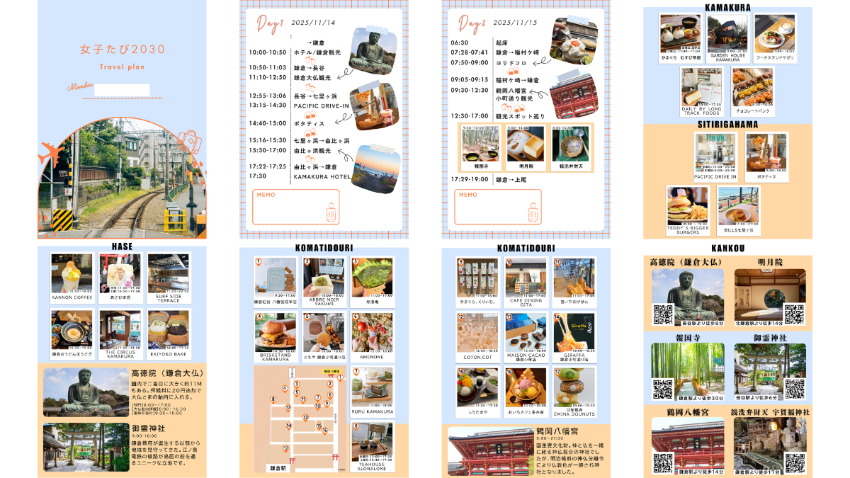 オリジナル鎌倉パンフレット MINAMO│15期クリエ・広報サポ隊 友達と鎌倉旅行へ行った際に作成したオリジナルパンフレットです。【目的】・事前に行きたい場所として保存していたお店を、視覚的に分かりやすくまとめたい・旅行へいった思い出として、形に残しておきたい