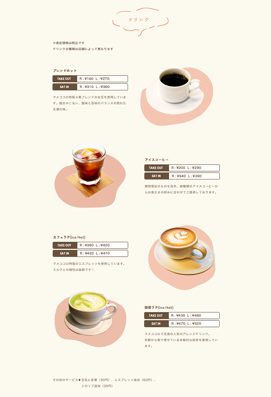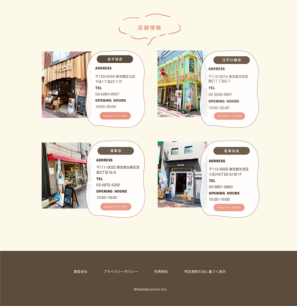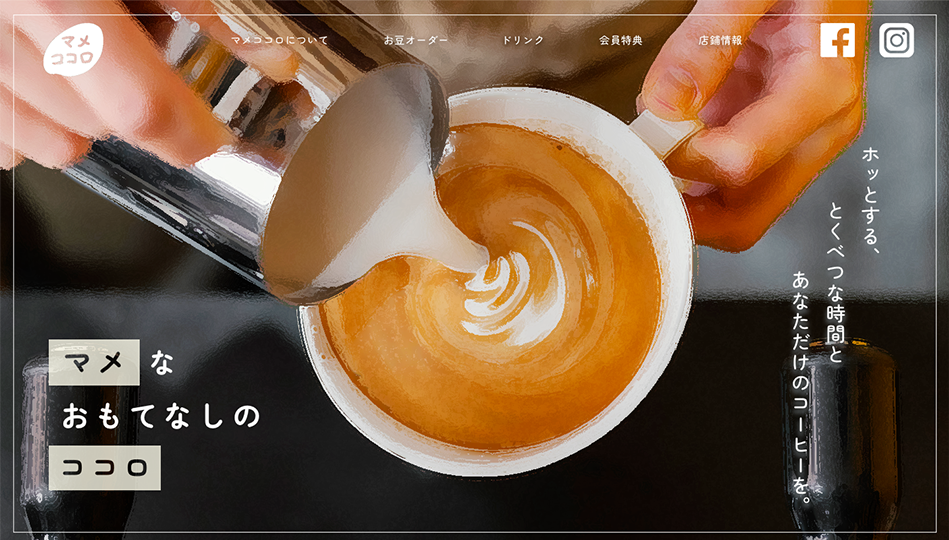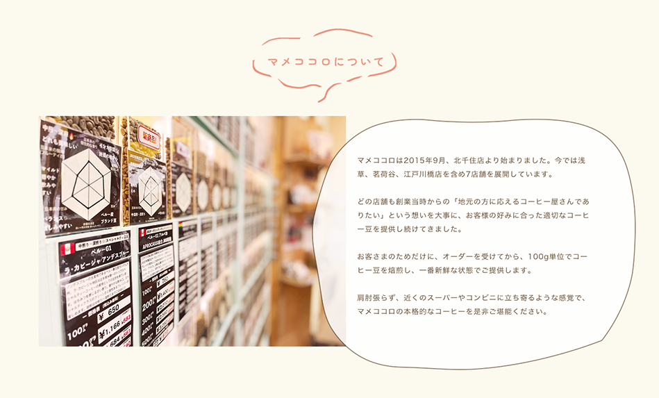 「マメココロ」のお店の名前にちなみ、「マメ」と「ココロ」は強調し、画像として作成して配置しました。