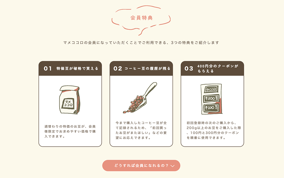 20〜40代の、コーヒーが好きで自分好みのコーヒー豆を定期的に購入したいと考えているカフェの近隣住民をターゲットに、コーヒー豆購入の常連のお客様になってもらう目的。