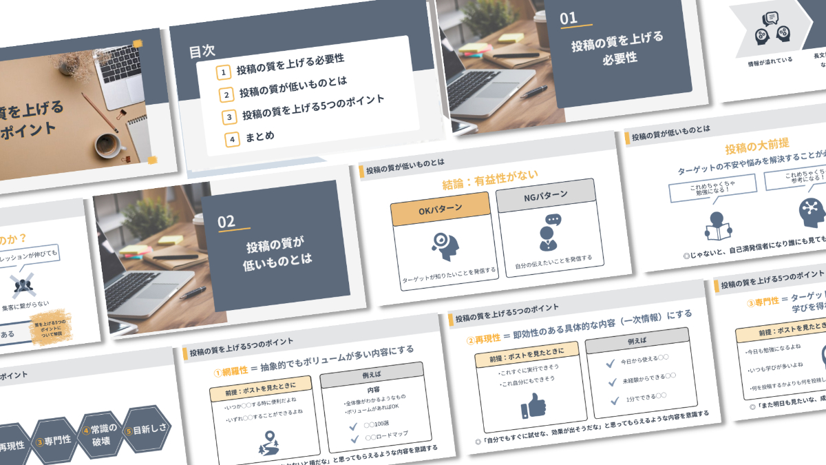 スライド資料 智愛(ともえ) スライド/図解デザイナー OVERVIEW 『Xで投稿の質を上げる5つのポイント』 X運用において、質を上げ収益化を求める発信者(男性)からの依頼を想定し制作しました。 【情報元コンテンツ】マインドマップ、台本【制作のポイント】ビジネスシーンに合うようグレー系で落ち着いた配色+アクセントカラーのオレンジがポイントわかりやすく、見やすくするため文字のジャンプ率を意識