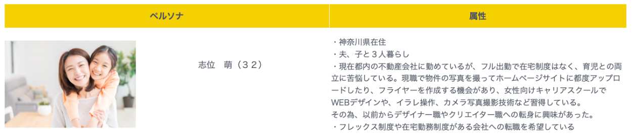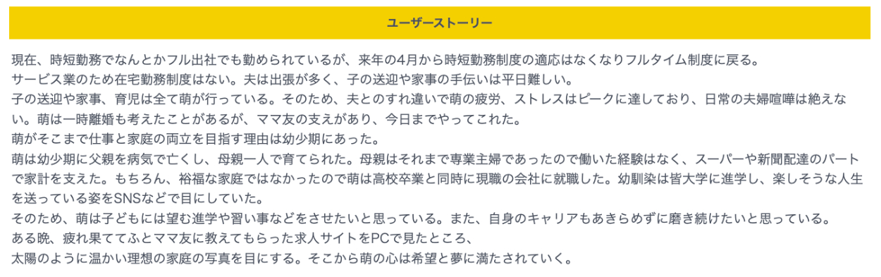 明確なブランドトンマナが決まっておらず、事業内容にあうトンマナを自由に提案してほしいと依頼書に記載があったためペルソナをもとにユーザーストーリーを考え設定。