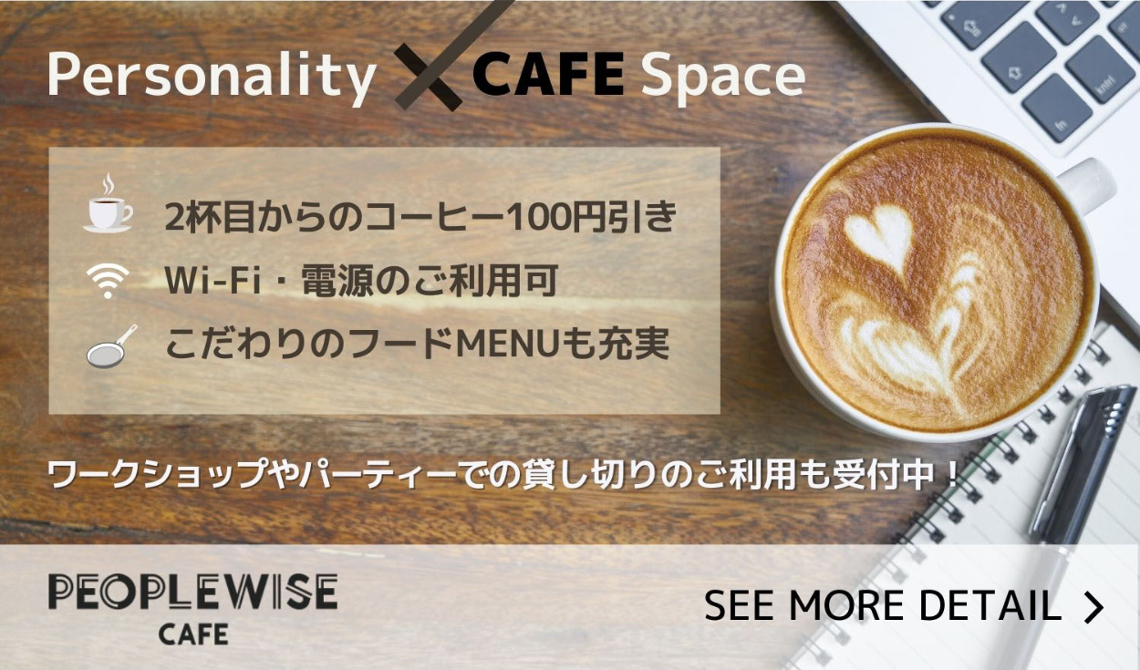 商品単価の高い貸しスペース利用を促すことがKPI促進に繋がるとの仮説から、カフェ利用特典の3つのポイントは控えめにして、貸し切り文言は白でアクセントとしました。「Personality × CAFE Space」は、カフェの第三のワークスペースであることを演出しています。ローマ字にすることで装飾のような扱いにしています。3つのポイントにアイキャッチを付けることで、パッと見で内容が分かるようにしました。