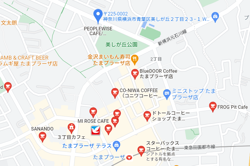 最寄りの駅周辺に競合カフェチェーンが点在している。(下記地図参照) - Company(自社):