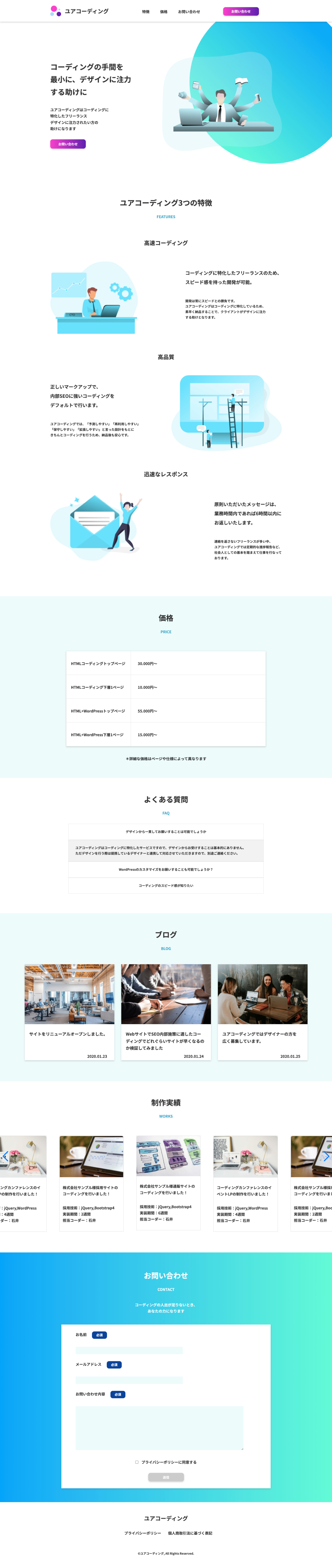Xdデザインデータからコーディングを担当しました。 ユアコーディングという架空のWeb制作会社のホームページとなっています。