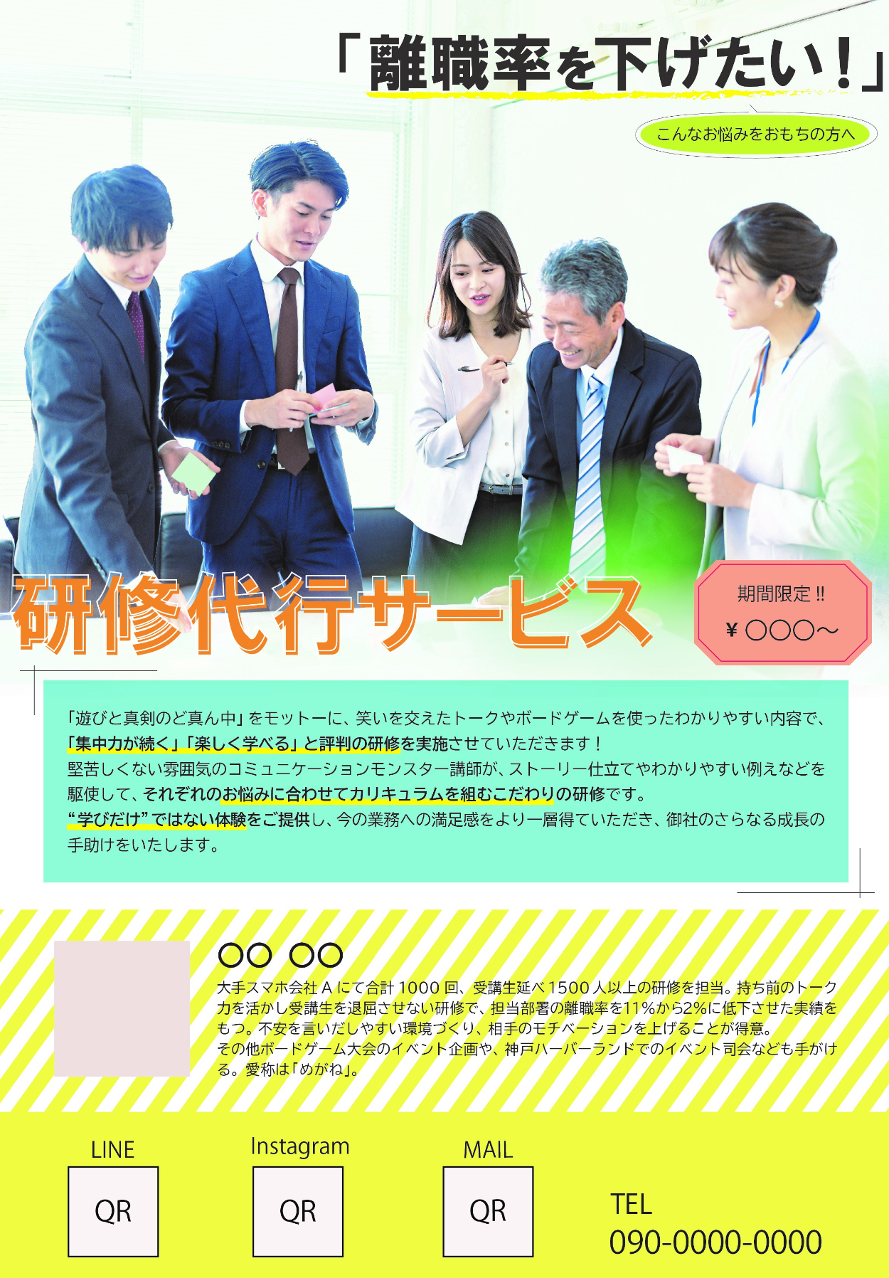 大手スマホ会社の研修担当者が、研修代行事業を立ち上げるための告知チラシ。