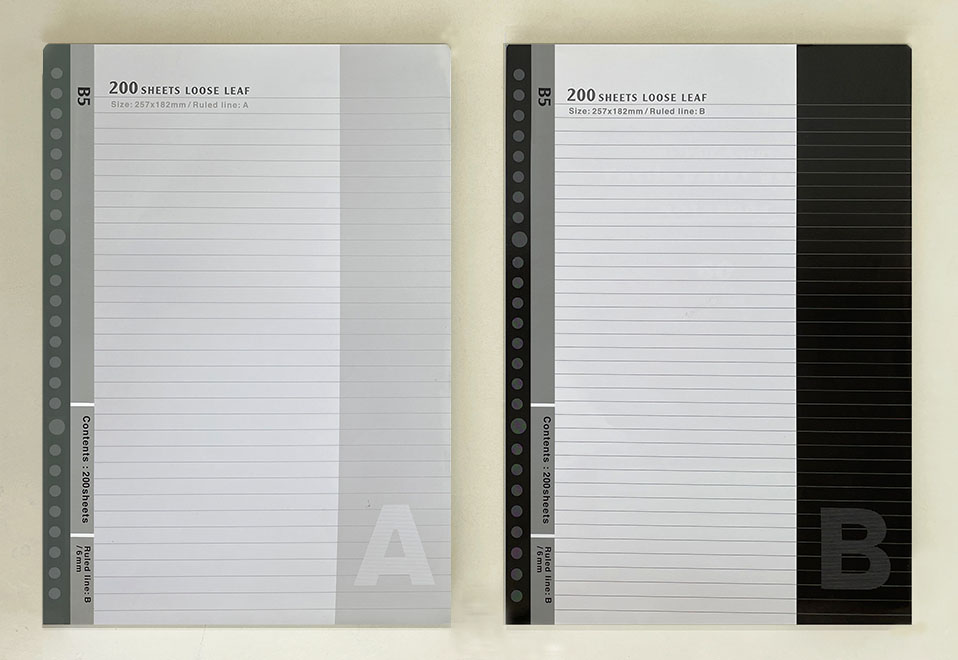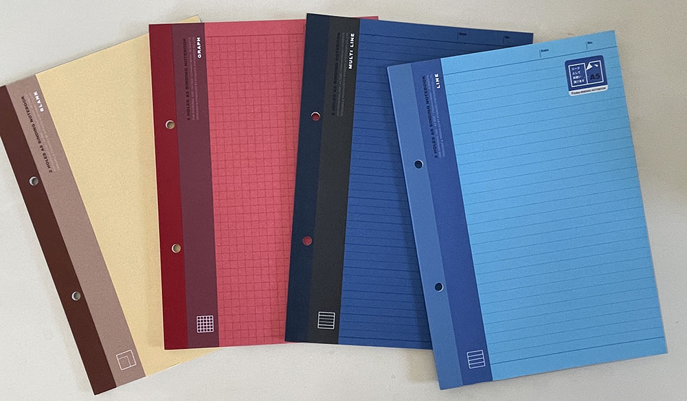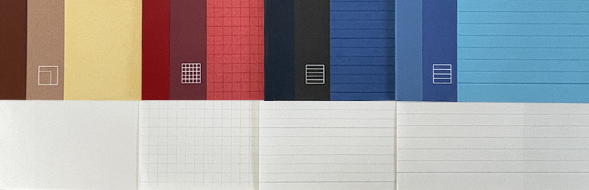 本文は下記の4種類。表紙には罫を表すピクトグラムを採用。店頭でひと目みて罫内容がわかる機能性とデザイン性のあるA5サイズのコンパクトノート。単体としても市販の2穴バインダーにセットして使用することができる2WAY仕様。