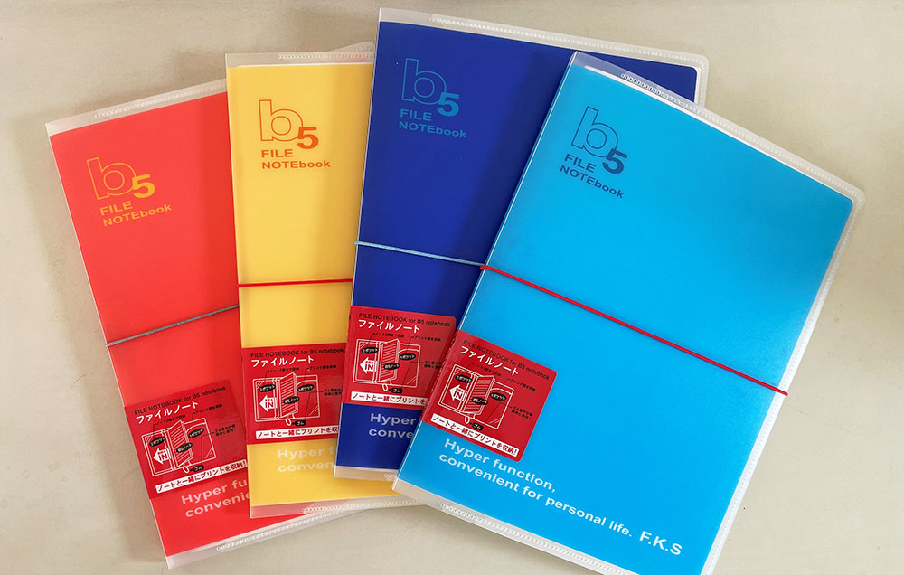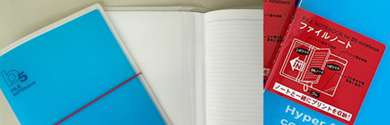 ファイル型(PP素材)のカバーに、好みのノート(B5サイズ)を自由にセットして使える。ポケットにプリントなど書類の収納も可能。