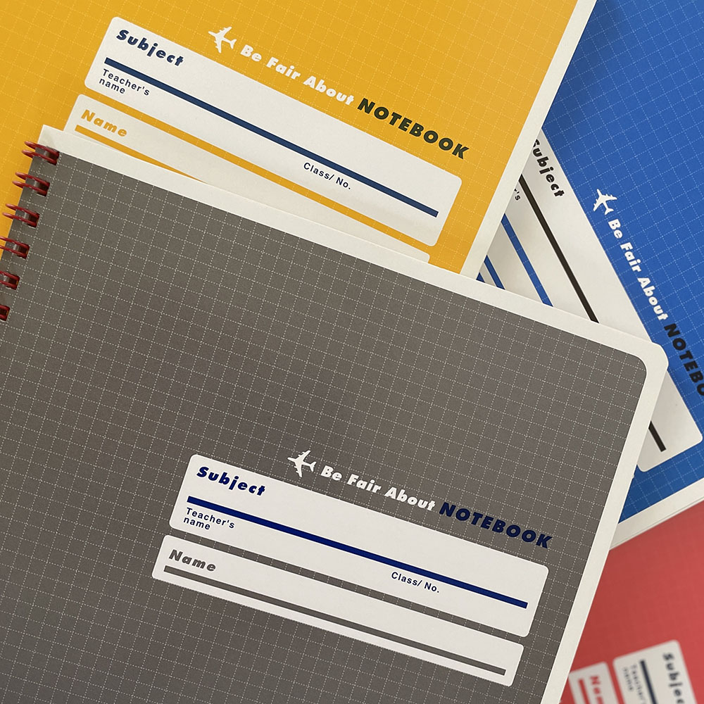 大きくあいたブランクスペースには、Subject(科目)、Grade(学年)、Class(クラス)、School(学校名)がしっかり書き込めるようになっており、国・算・数・理・社など...好きな色選んで科目別に使い分け、スクールノートとしてもちゃんと機能するよう企画。