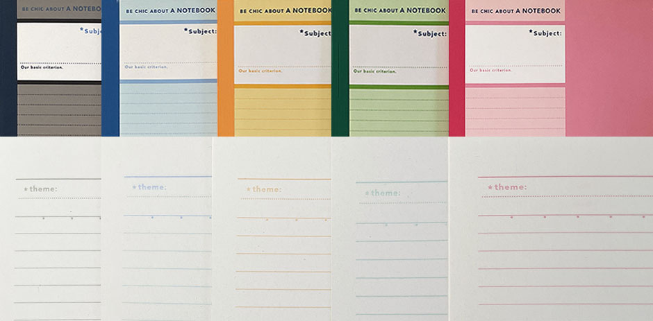 グレー・ブルー・イエロー・グリーン・ピンク。使っていて気分がが上がりそうな、本文罫と表紙のカラーをコーディネートとした多目的に使えるノート。