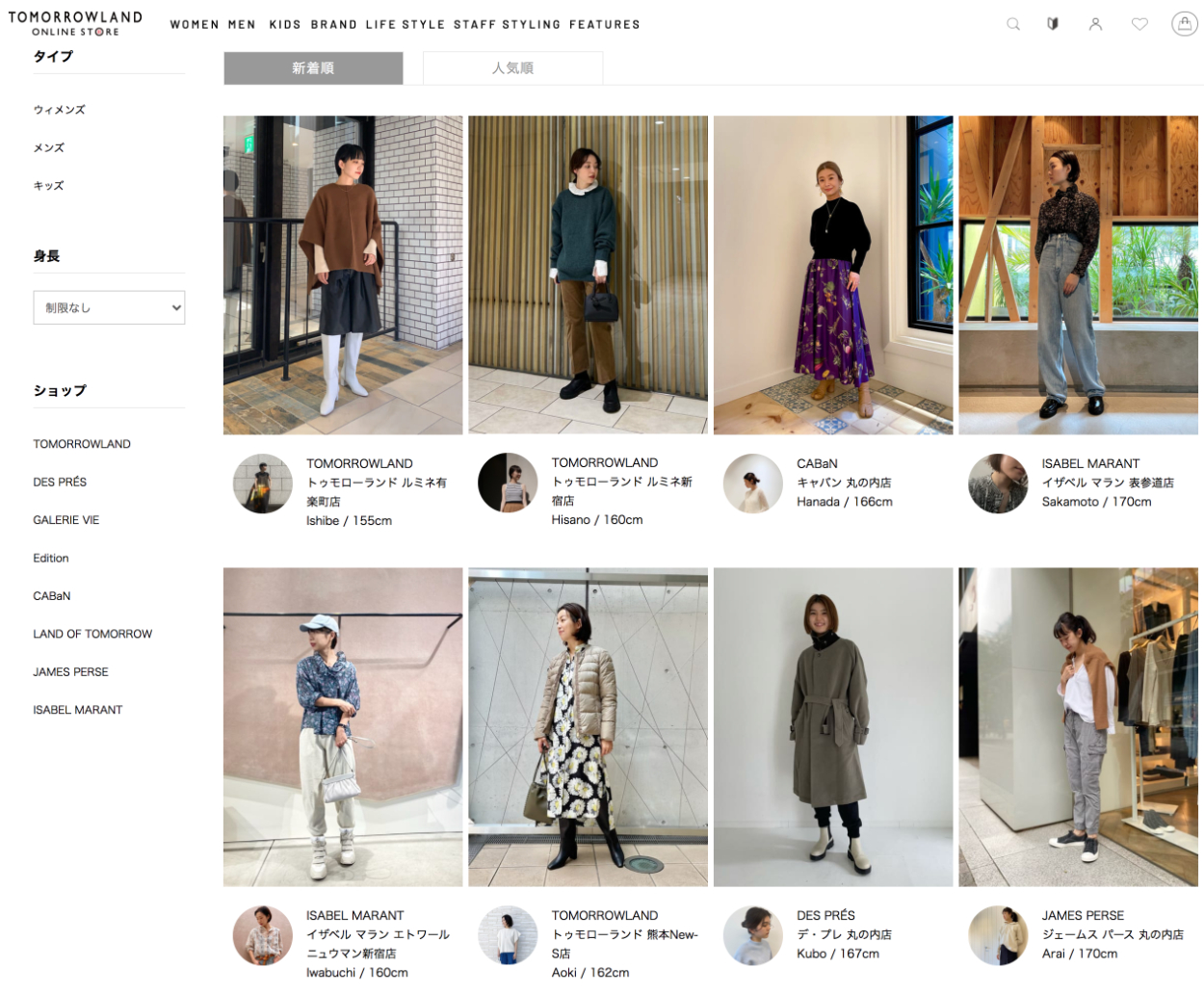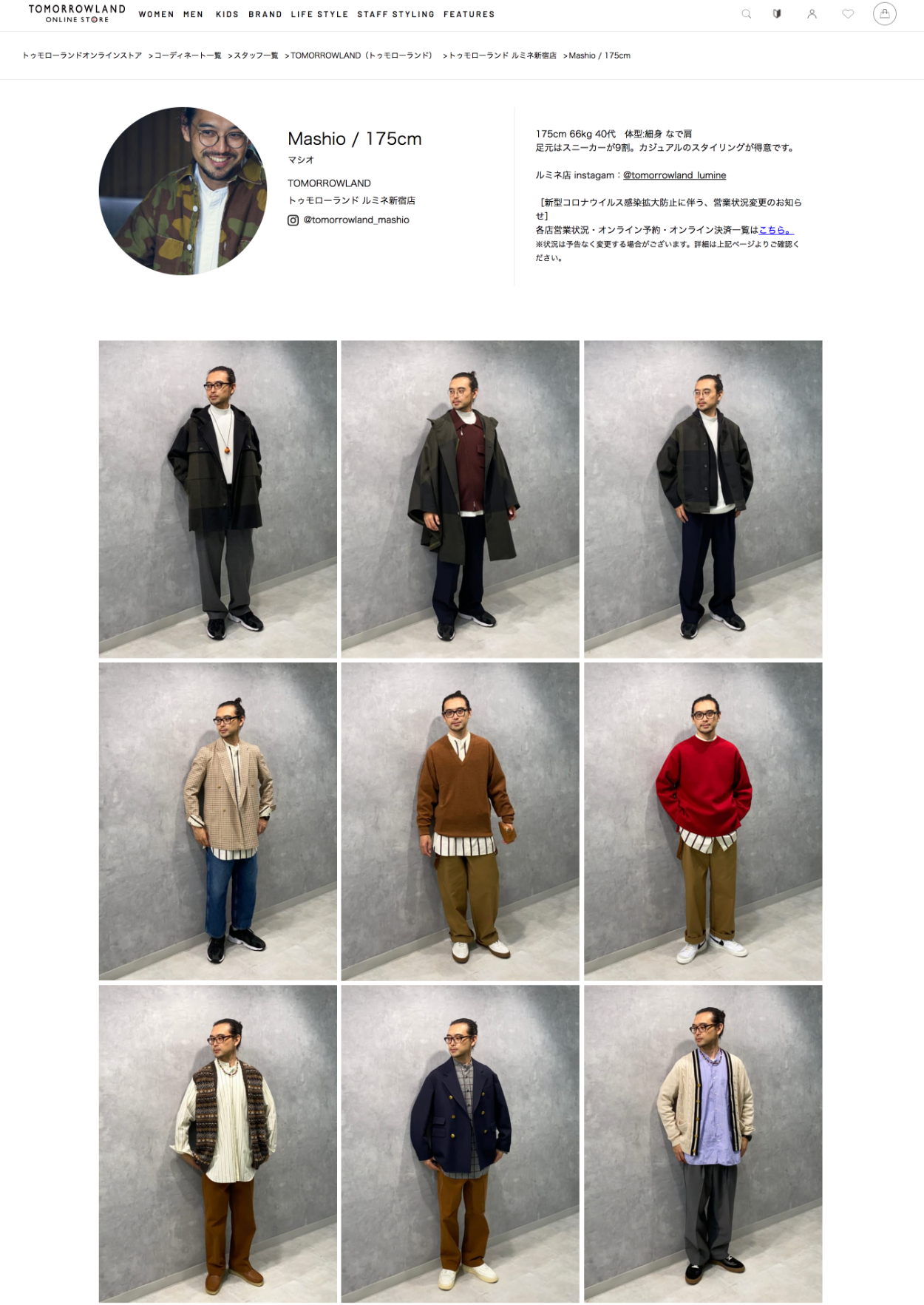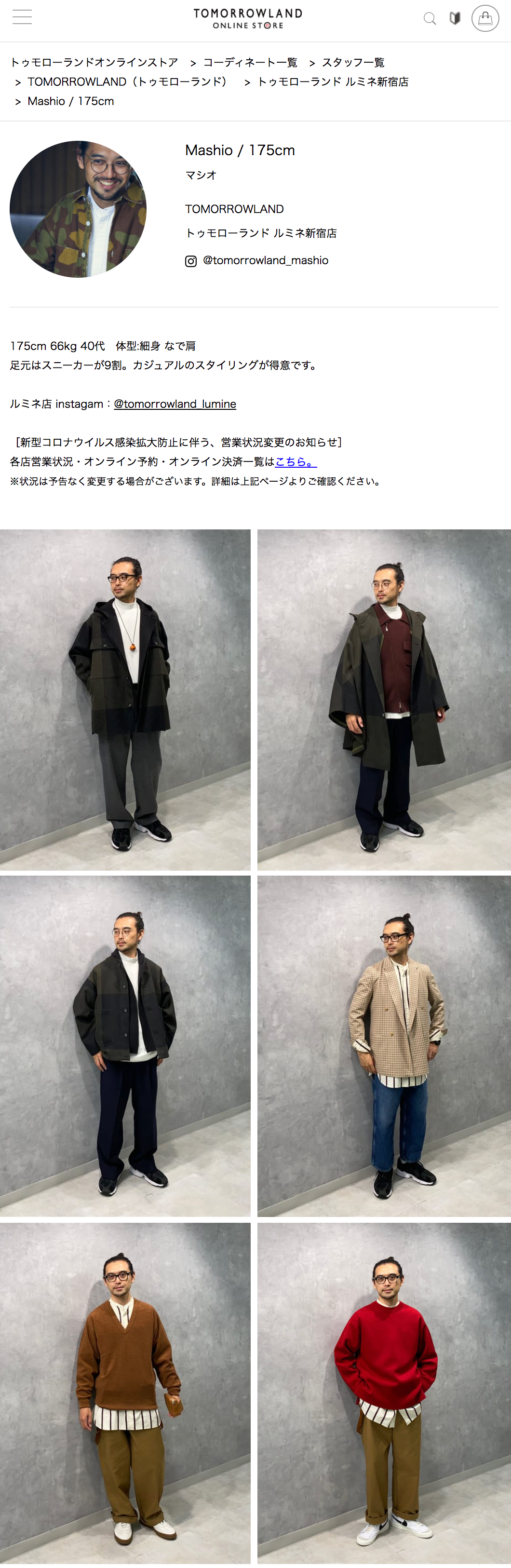 - スタッフ詳細ページ(URL末尾の数字はスタッフIDによる)https://store.tomorrowland.co.jp/coordinate/staffview/31117