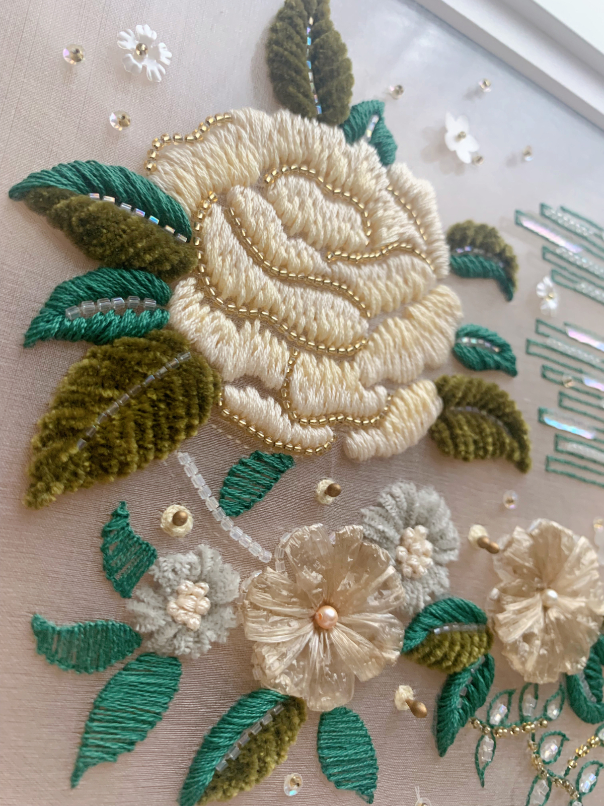 立体的な花のモチーフを中心に、素材が持つ光沢や重なりを意識して構成しています。刺繍の技法と素材の組み合わせによって、絵画のような奥行きを表現することを目指しました。