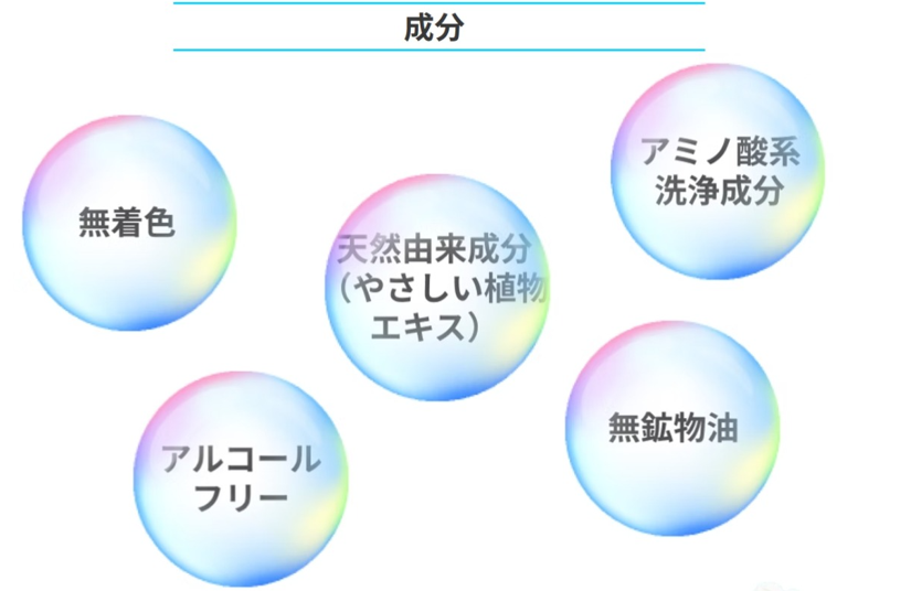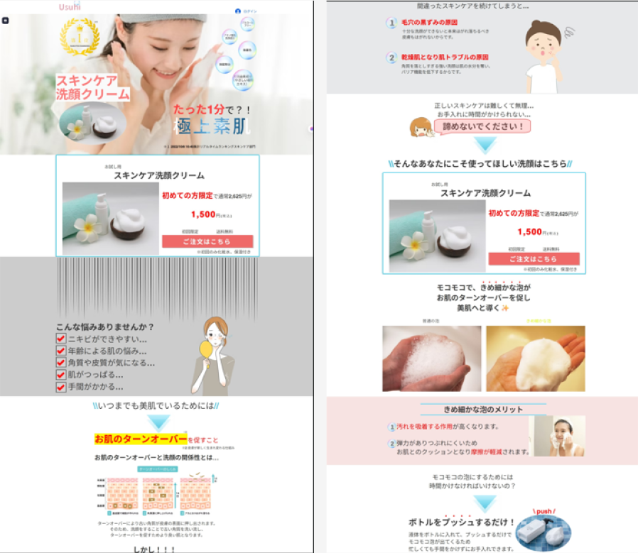 - 洗顔を商品としているため泡を活かしたいと思い、ポイントの数字の背景を泡にしたり成分説明の背景を泡にしたりして統一感が出るようにしました。