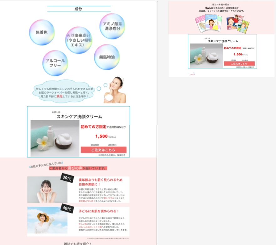 - 忙しい人はサイトを見る時間も確保することが難しいこともあると思うためトップページの次に商品説明を入れてどのような商品なのかすぐに分かるようにしました。