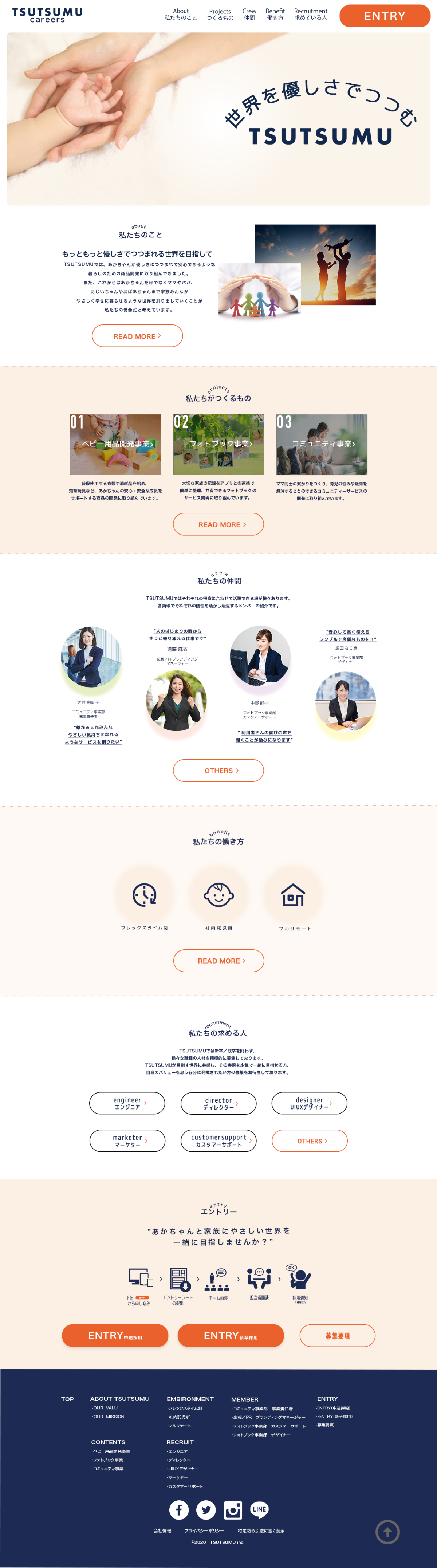 エントリー対象が新卒・中途、男女を問わないことを考慮し、トンマナのカラーをネイビーとオレンジを基調としました。その中でも世界を優しくしつつむというコンセプトが反映できるような色合いの調整を行うことができました。また、アイコンの形やアニメーション、フォント選びの工夫や写真の加工を行い”やさしさ”を表現しました。