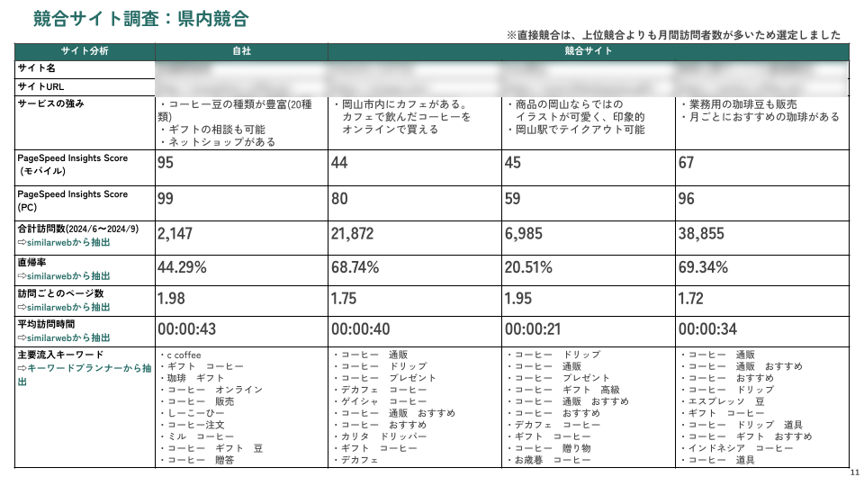 - PageSpeedInsightsScore、Similarwebを用いて題材Webサイトと競合Webサイトのページ読み込み速度、直帰率等を調査