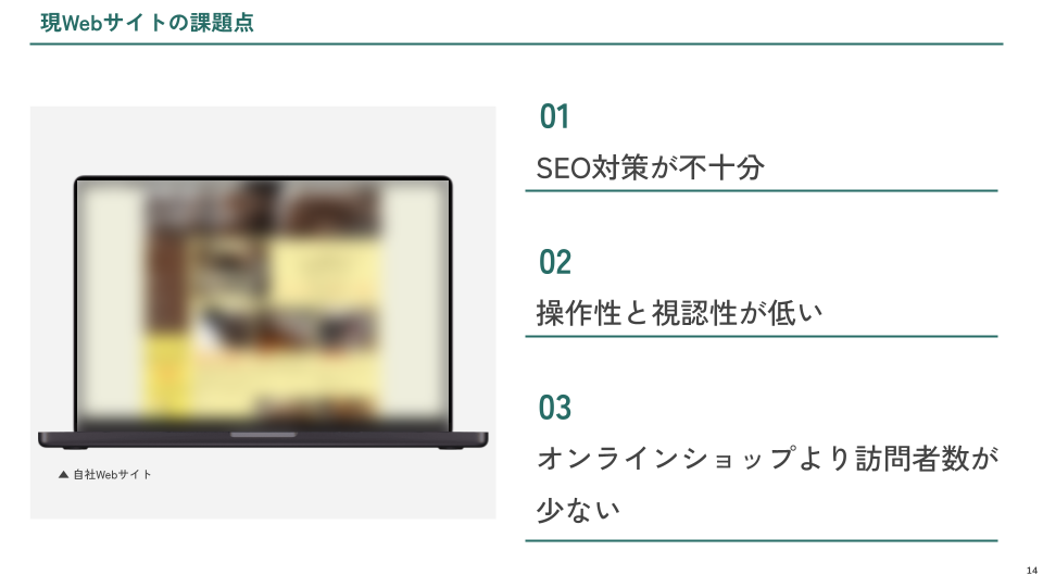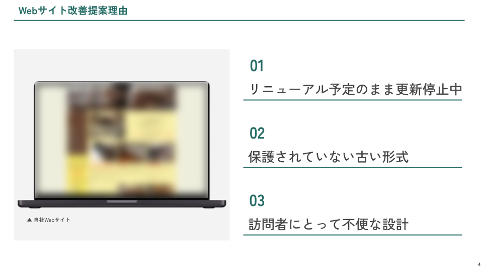 題材Webサイトが古い形式のWebサイトだったため、全面的にリニューアルを提案する形となりました。自主的に改善後Webサイトのデザインカンプを作成して、具体的にイメージしていただけるようにしました。また、各コンテンツのポイントを端的に説明しております。