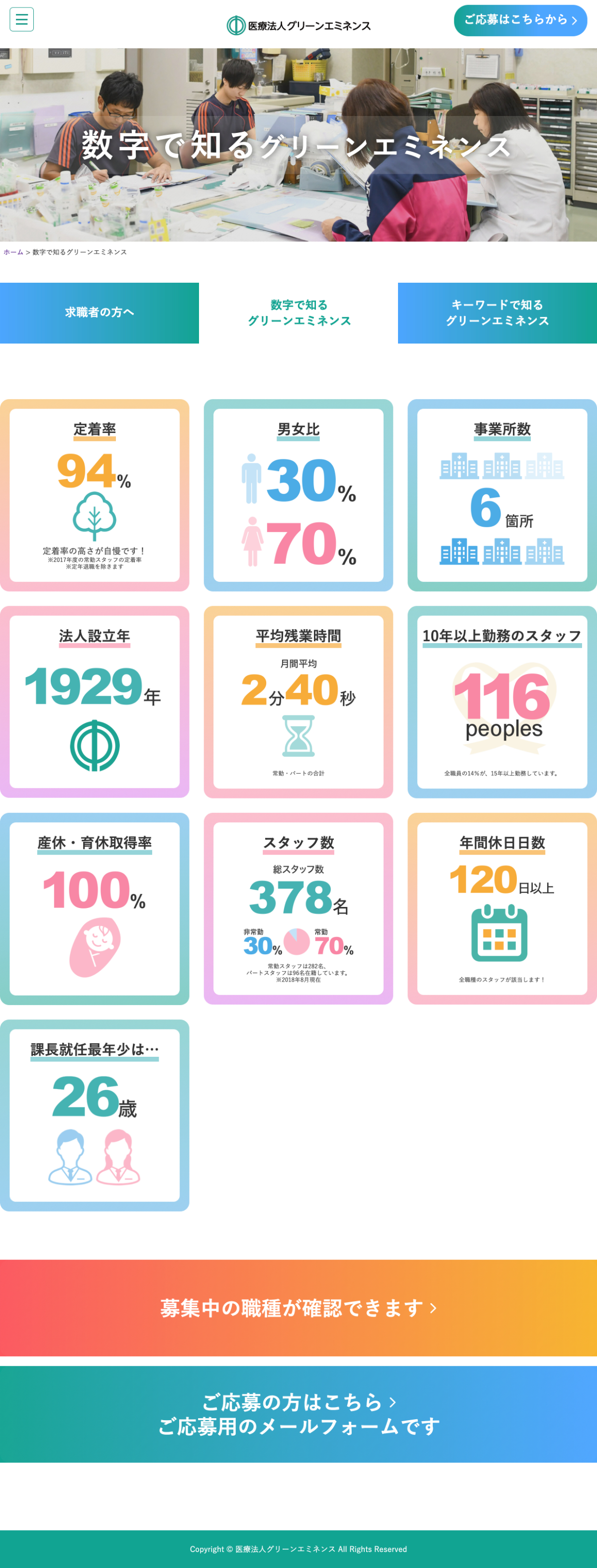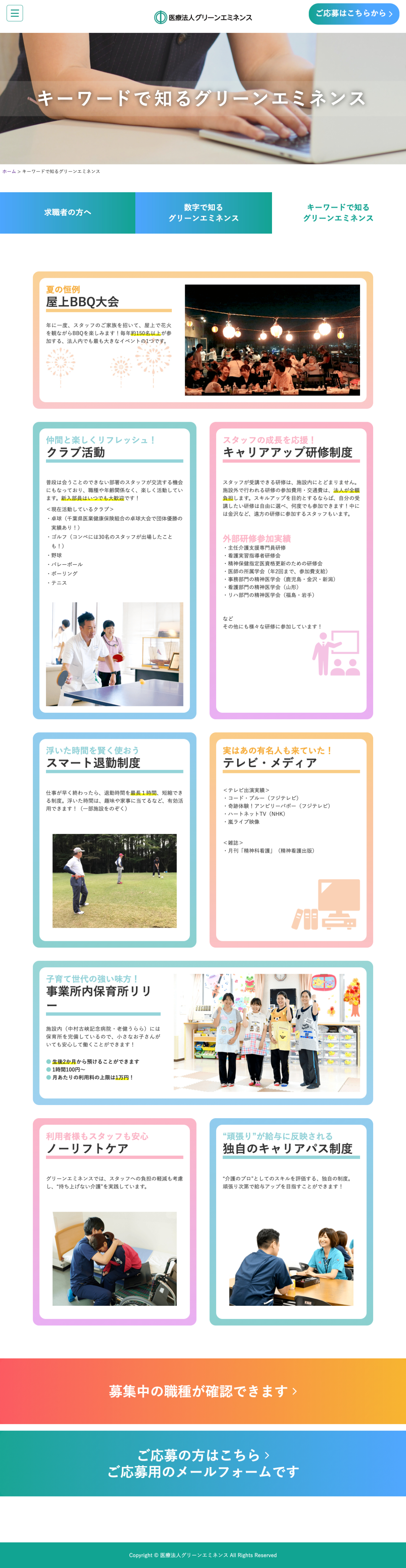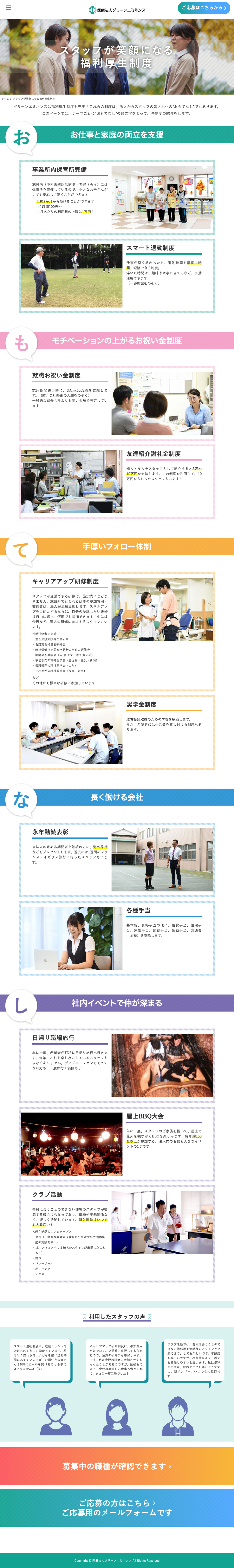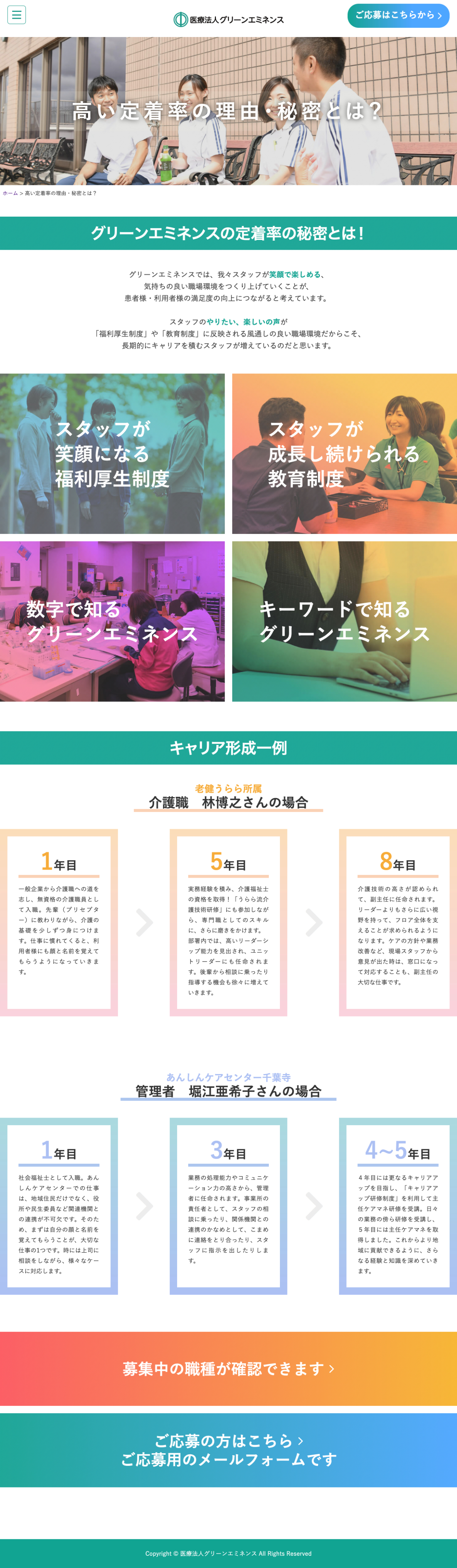 制作(担当ページ):高い定着率の理由・秘密とは? キーワードで知るグリーンエミネンス 数字で知るグリーンエミネンス 求職者の方へ スタッフが笑顔になる福利厚生制度