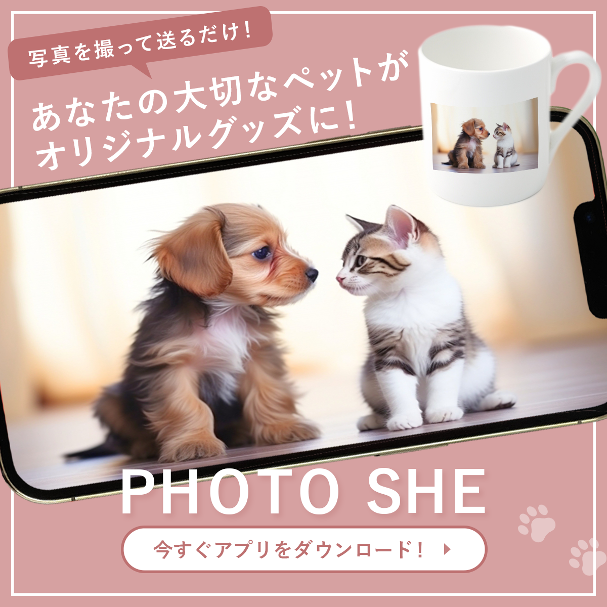 <要件定義> 【サイズ】 幅1200px × 高さ1200px 【必須テキスト】 ・写真を撮って送るだけ! ・おなたの大切なペットがオリジナルグッズに! ・今すぐアプリをダウンロード! ・サービス名(PHOTO SHE)ロゴ(事前配布あり) 【その他】 ・犬または猫の写真を使用する ・オリジナルグッズはマグカップを想定 ・ロゴの色はデザインにあわせて変更可能