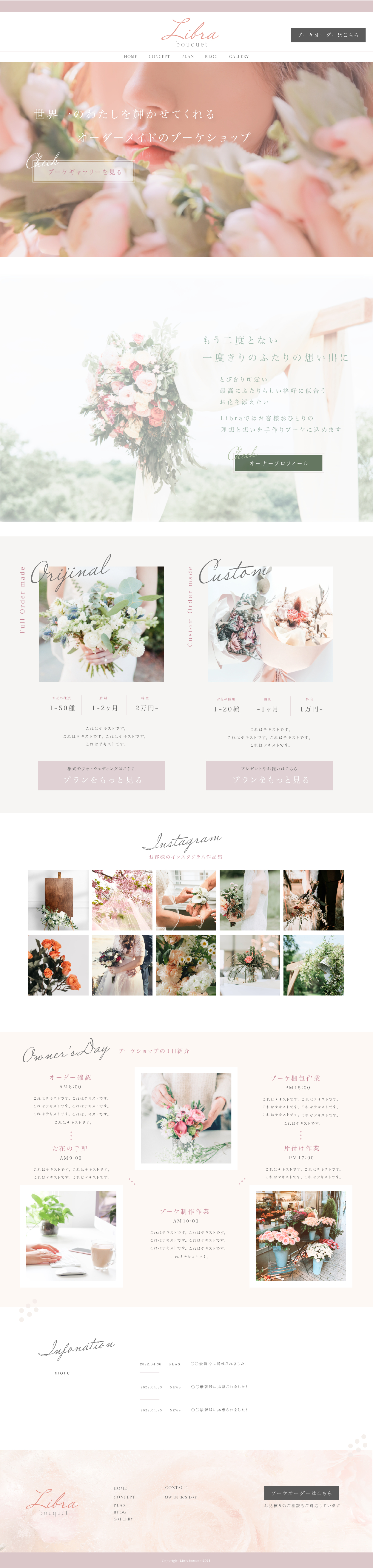 オーナーの1日の仕事の様子のセクションを入れて、どのようにブーケが作られているのか知ってもらうことでオーダーしやすいよう親近感を持ってもらえるようにしました。