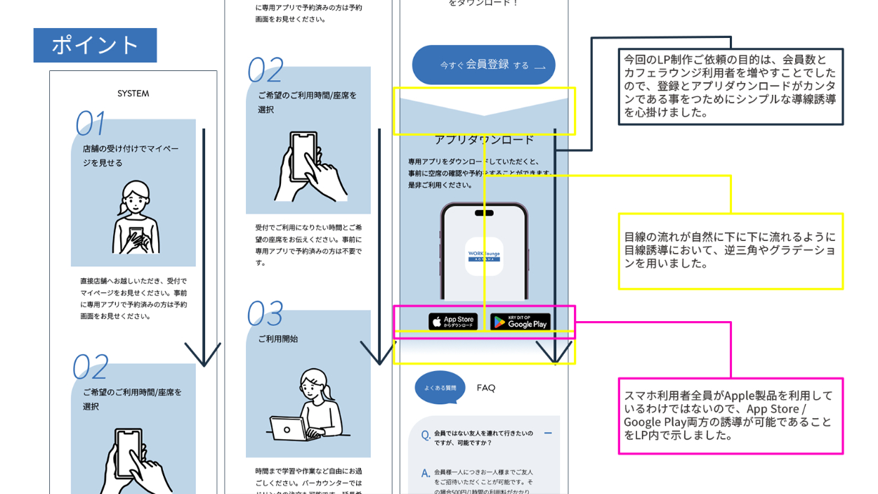 ----------------------------------------------------------------------------------カフェラウンジの使用は少し勇気がいるが、利用してみたいなと思っていただけるようにシンプルなLPにし、目線誘導を意識しました。